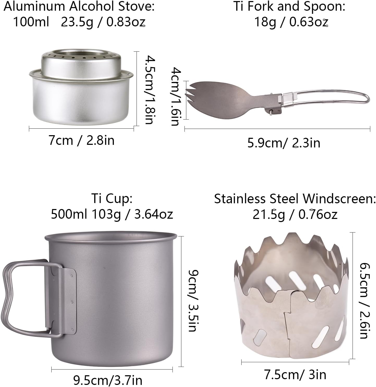 [Versatile Usage] Perfect for camping, hiking, backpacking, fishing, and emergencies. [Durable Construction] Ti and aluminum build, lightweight at 167g ideal for backpacking and hiking. [Premium Material] Crafted from high-quality ti for lasting strength, no metallic taste. [Ultra-convenient] All components fit perfectly in the ti cup for easy storage and portability. [Easy Cleaning] Round edges and smooth surfaces ensure hassle-free cleaning post-use. Spec: Material: Ti Cup, Ti Fork and Spoon, Aluminum Alcohol Stove, Stainless Steel Windscreen Capacity: Ti Cup 500ml; Alcohol Stove 100ml Size: Ti Cup: 9 x 9.5cm / 3.5in x 3.7in Ti Fork and Spoon: 5.9 x 4cm / 2.3in x 1.6in Aluminum Alcohol Stove: 7 x 4.5cm / 2.8in x 1.8in Stainless Steel Windscreen: 7.5 x 6.5cm / 3in x 2.6in Weight: Total Set Approx. 167g / 5.89oz Ti Cup Approx. 103g / 3.64oz Ti Fork and Spoon Approx. 18g / 0.63oz Aluminum Alcohol Stove Approx. 23.5g / 0.83oz Stainless Steel Windscreen Approx. 21.5g / 0.76oz Package List: 1 x Ti 500ml Cup with Lid 1 x Ti Fork and Spoon 1 x Aluminum Alcohol Stove 1 x Stainless Steel Windscreen