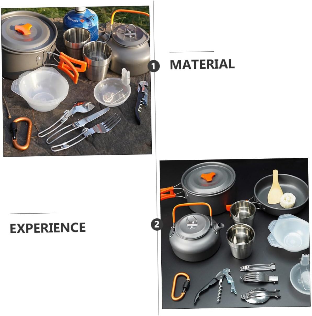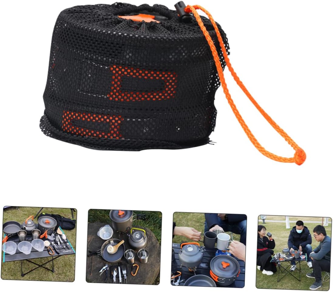 Package List 1 x cauldron 1 x pot cover 1 x teapot 1 x teapot lid 1 x frying pan 2 x cups 1 x bottle opener 1 x quick hanging 1 x set of 3 pcs tableware 1 x mesh bag 1 x packing box 3 x bowls 1 x spoon 1 x towel gourd 1 x soup spoon Characteristics -Color: Orange portable cutlery -Material: Aluminum alloy aluminum alloy cookware -Packing size: About 26.00X18.00X10.50cm/10.23X7.09X4.13inch - Crafted with aluminum alloy material which can stand high temperature and weight camping cookware. - and for outdoor camping, hiking, climbing supplies camping utensils. - A collapsible handle with a plastic cover can protect you from burns camping cookware kit. - Lightwight and portable, easy to clean and carry camping tool. - The non-sticky and foldable design provides great convenience for you camping pots.Goods Descriptioncamping tool as a friends who like outdoor adventures.camping pots This camping cooking set has been carefully designed to make your camping experience more fun and convenient.aluminum alloy cookware This item is a set of outdoor cookware, manufactured with aluminum alloy material for to use
