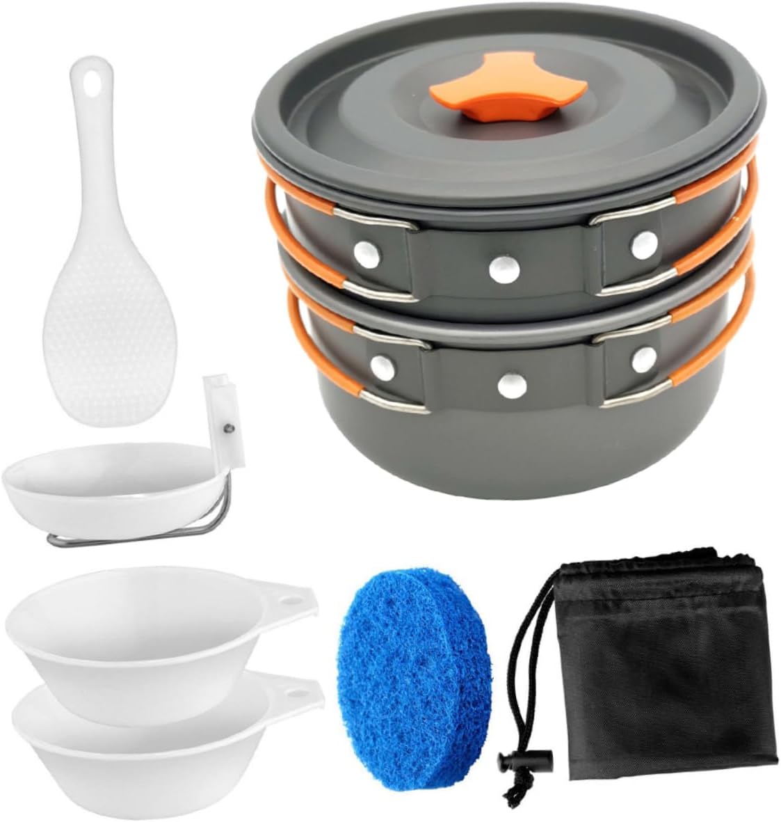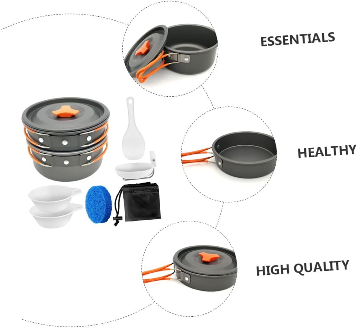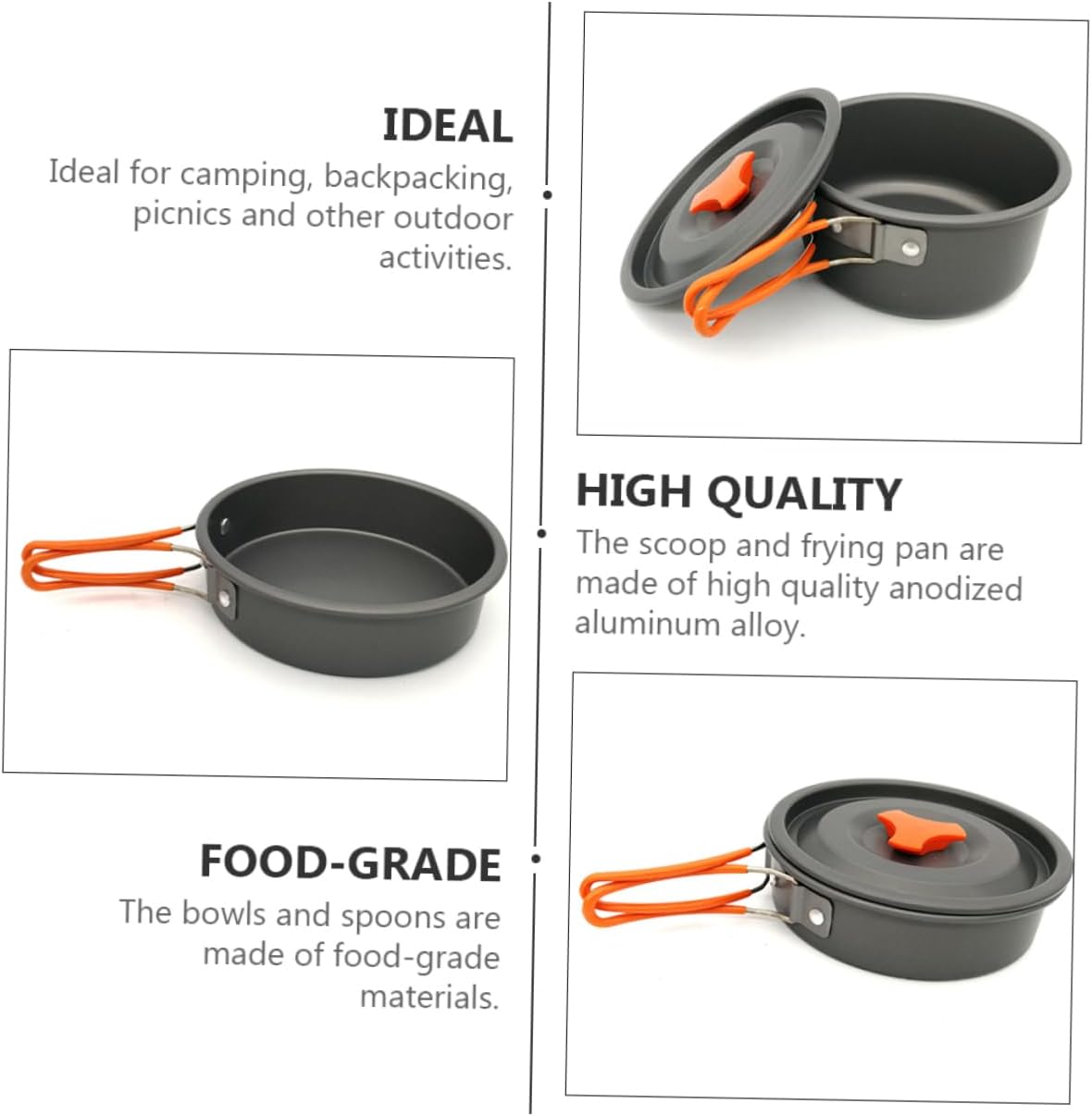 Package List 1 x Pot 1 x Frying Pan 1 x Soup Scoop 1 x Dining Spoon 2 x Plastic Bowl Features -Material: Aluminum Alloy camp cooking kit -Pot Size: 14.00X7.00cm/5.51X2.76in backpacking cookware -Frying Pan Size: 15.00X4.00cm/5.91X1.57in camp cooking gear -Color: Assorted Color camping tableware -Exceptionally lightweight so that your barely feel the weight within the pack on your back portable camping cookware. -The package is light and sturdy, and to use camping cooking kit. -The non-sticky and foldable design provides great convenience camp cookware. -The anti-skid design of the handle can provide a firm and comfortable grip for your hand camping cookware. -It take ups little space, makes it convenient to store while not in use multi-function tableware for camping.Goods Informationmulti-function tableware for camping The non-sticky and foldable design provides great convenience for you, the set is lightweight and sturdy, each piece has a non-stick coating, easy to clean and to use.portable camping cookware The anti-skid design of the handle can provide a firm and comfortable grip for your hand