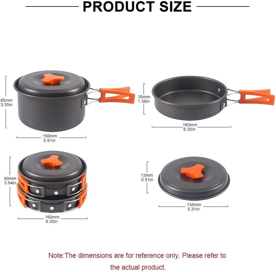Name: Portable outdoor tableware setMaterial: Aluminum alloyWeight: Approx 402g / 14.18ozSuitable for: Camping trekkingFine polishing process,This outdoor cooking set ismade of hard aluminumoxide and fine polishingprocess which is strongand .The handle design,Adopt circular symmetrical handle design, stable handle not easy to slip off.