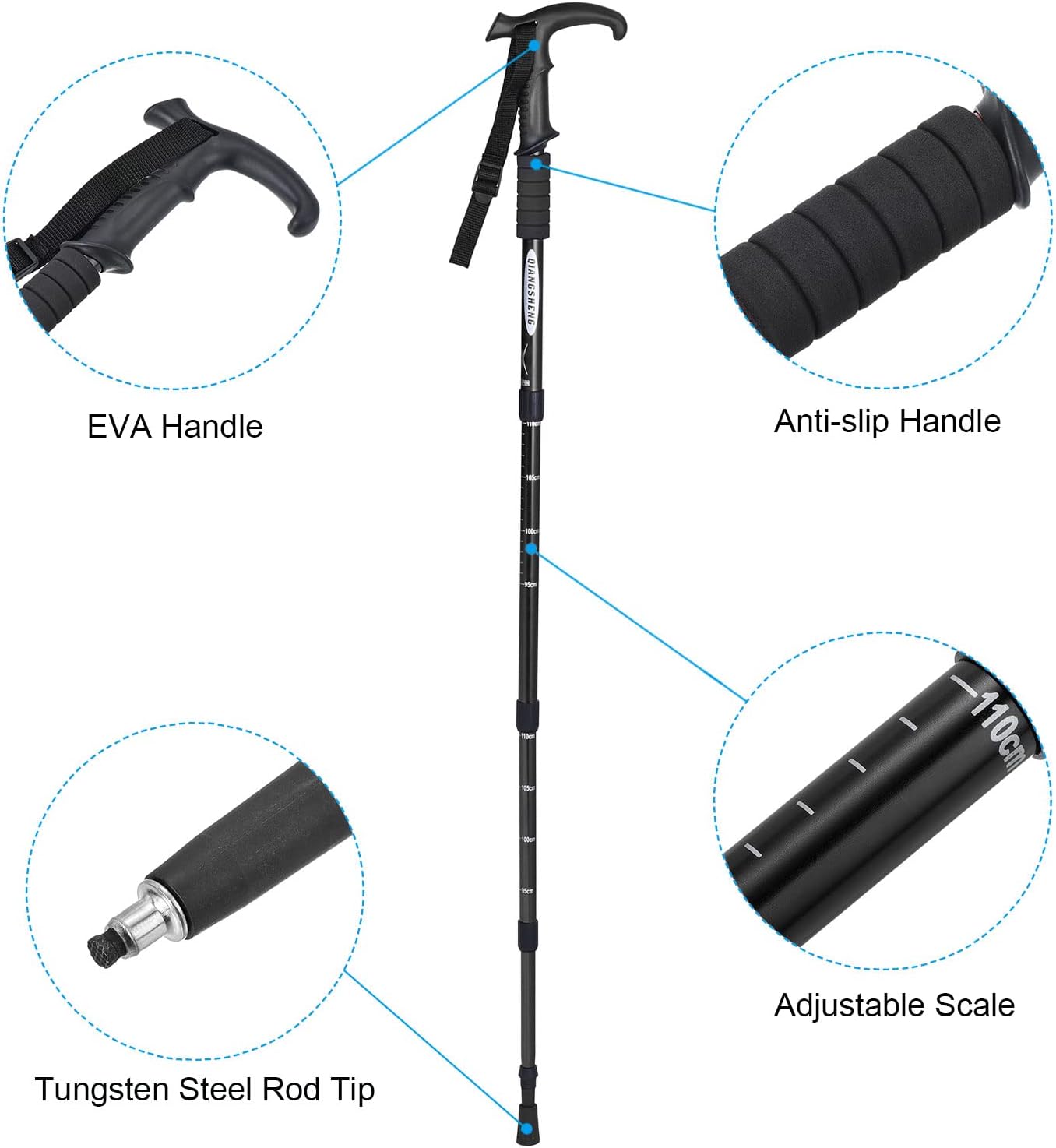 This hiking pole provides folding section design. Suitable for backpacking, walking, hiking, camping and other outdoor activities.AdvantageThis hiking trekking pole is made of aluminum alloy, lightweight and durable. EVA foam grip keep your hands dry from sweat.This hiking trekking pole only weighs , can be folded to store in your backpack or luggage.Instruction1.Unscrew the locking device.2.Open or retract to the desired length3.Tighten the locking device until it is fully lockedNOTE: Do not exceed the stop mark when adjusting, it will not be possible to tighten.