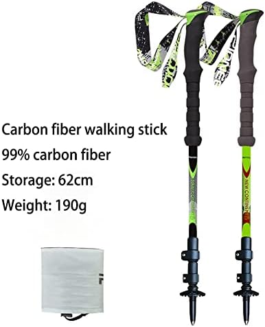 Name: trekking poleMaterial: carbon fiberWeight: 190 (g)Size: 62.5 cmColor: black, fruit greenLength: 62-135, 620-1350 (mm)Handle: Lightweight EVA handleLock: double lockouter Material: about 99% carbon contentPaint finish: Protective paint finishNumber of sections: 3 sectionsTip: Tungsten steel tipColor: 2 colorsFoot cover: thick bottom cover
