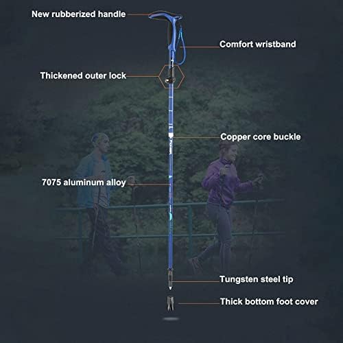 Name: Ultra-light folding hand stickMaterial: aluminium alloyPipe diameter: 18/16/14/14/14mm. Material: 7075 aluminium alloyNumber of sections: 5 sectionsSize after storage: 29cm. Lacquer: MatteHandle: Rubberized handleLock: thickened outer lockWeight: 259gAdjustable length: 85- 105cm. Tip: Tungsten steel tip + 0.354 cm. In thick solecolour: Blue