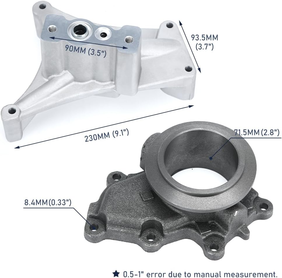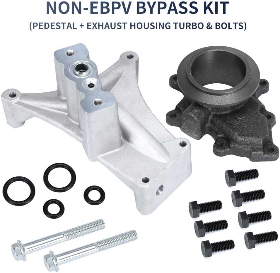 Application: For 1999.5-03 7.3L Powerstroke Diesel. (Engine Models)For 1999-2003 F-250 Super Duty 7.3L V8.For 1999-2003 F-350 Super Duty 7.3L V8.For 1999-2002 E-350 Econoline Club Wagon 7.3L V8.For 2000-2003 Excursion 7.3L V8.For 2003 E-350 Club Wagon 7.3L V8.(Vehicle compatibility charts are for REFERENCE ONLY. Check your vehicle with OEM below to match your needs)Package Included: 1x Non-EBP Pedestal.1 x Non-EBP Turbo Outlet Flange.4 x O-rings.2 x Long Mounting Bolts.7 x Short Mounting Bolts. (100% Brand New Never Used Or Installed)(Pedestal dose not include EBP Actuator, need to buy an additional Isolator Pigtail)Specification:Material: made of high quality Aluminum & Iron.Function: Housing Turbo help to collect the exhaust gases, control boost and exhaust pressure.Note: No installation guides are included, we highly recommend to seek professional installation. Any damage during installation will not be refunded.