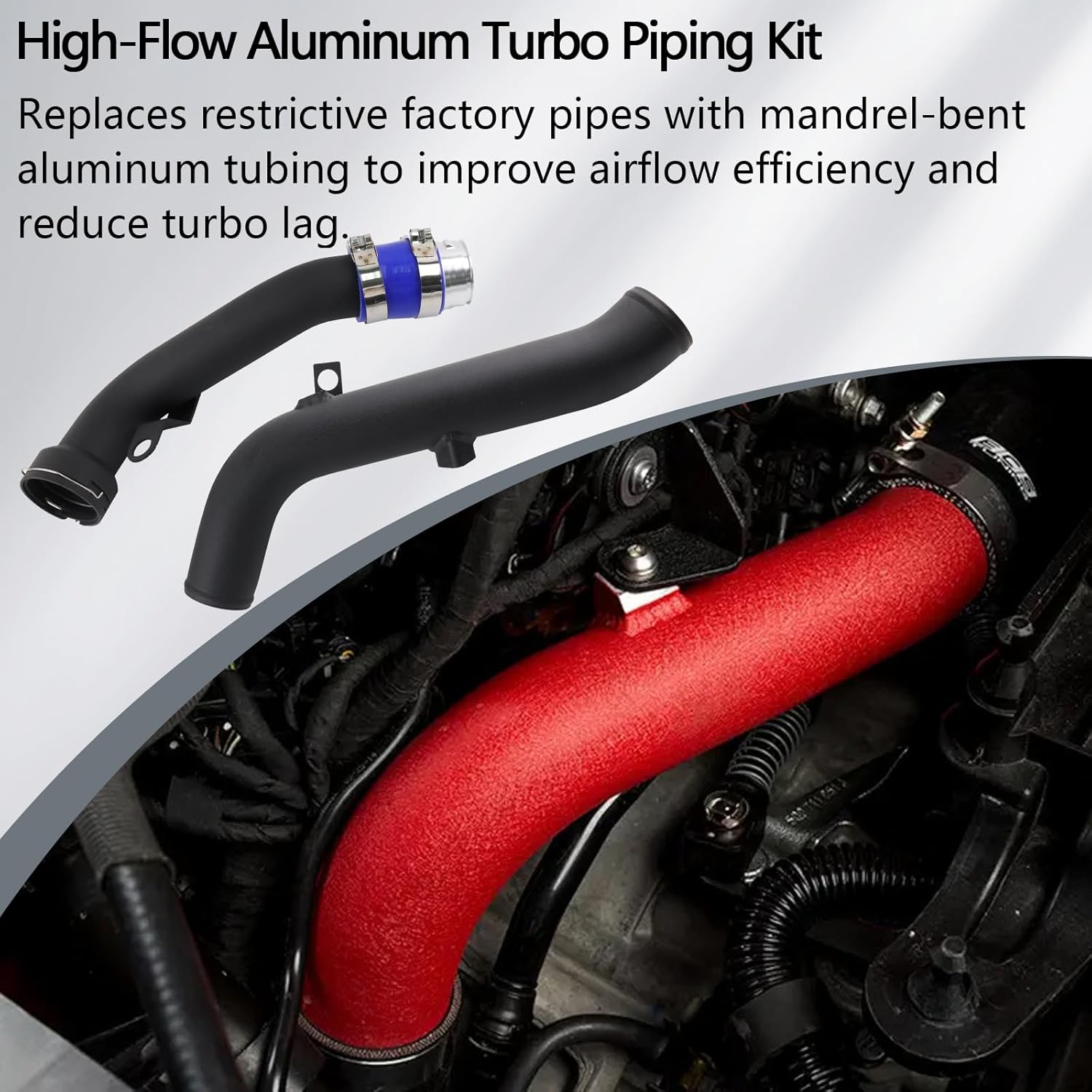 Upgrade your turbo system with this high-performance Turbo Pipe Kit, designed to enhance airflow and durability. The kit includes a Turbo Outlet Pipe and Throttle Pipe, both crafted from mandrel-bent aluminum tubing to ensure maximum efficiency. Unlike restrictive factory plastic pipes, this setup minimizes pressure loss and improves throttle response. The Aluminum Turbo Pipe Kit comes with all necessary hardware, including silicone couplers and stainless steel clamps, for a straightforward installation. Its powder-coated finish ensures long-lasting protection against heat and corrosion, maintaining a clean OEM-style appearance.
