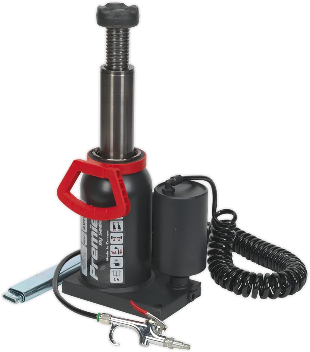 Product Description Air/Hydraulic bottle jacks capable of both air assisted or manual operation. Fitted with safety overload valve and manufactured in the EU. All steel, one-piece base, reservoir and pump cylinder design gives added strength. Fully serviceable ram piston with extension screw. Both models supplied with 90° rotating pump and telescopic pump handle and have moulded carry handles incorporating storage for the pump handle. Service kits readily available. Set Contains: 1 x Bottle Jack