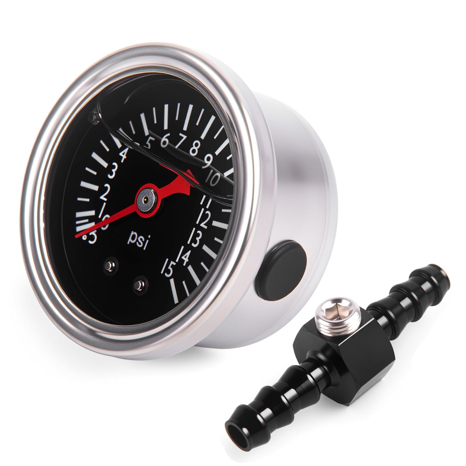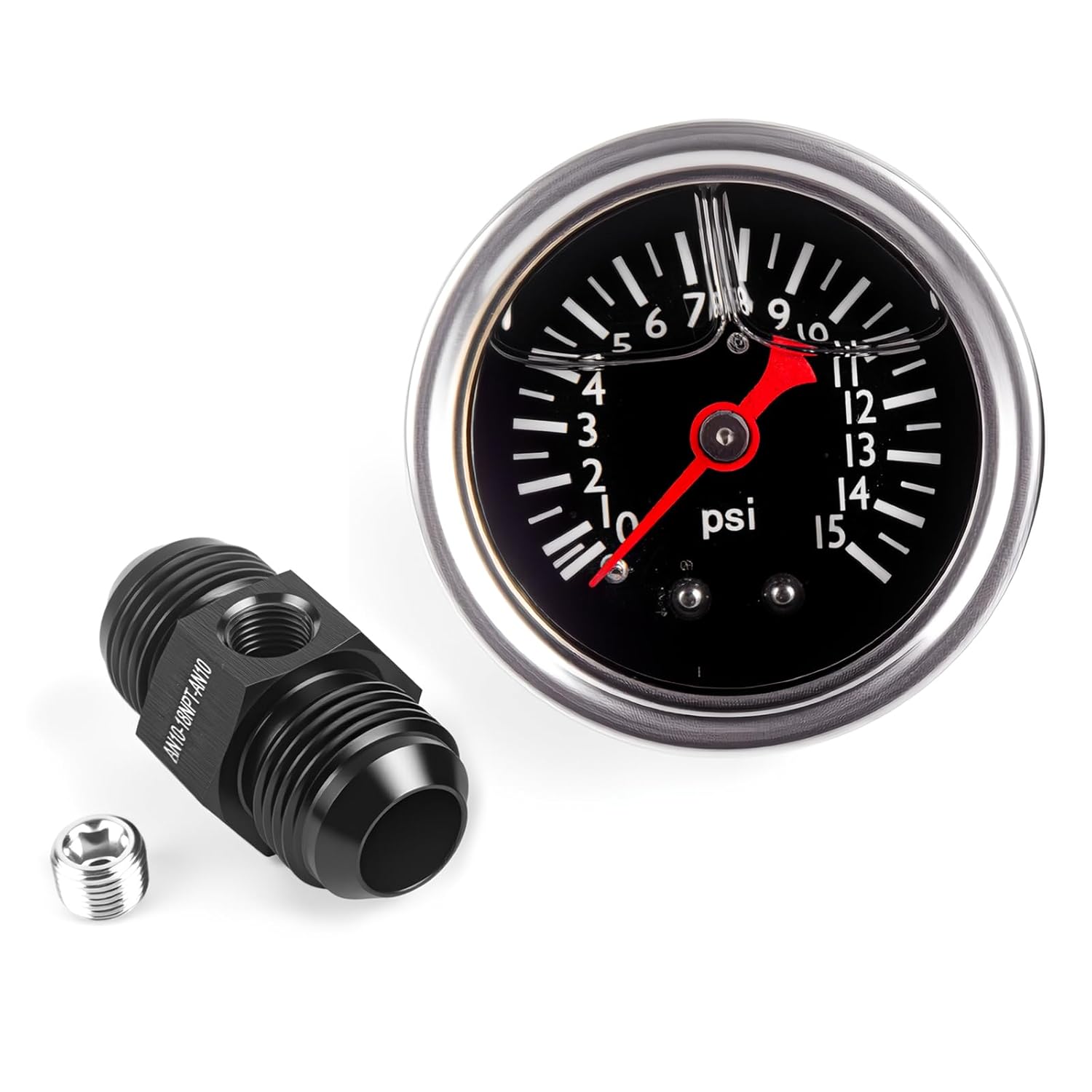 Features:Fuel Pressure GaugeRange: 0-100 psiThread Type: 1/8" NPTDial size: 1-1/2"Gauge Body size(Outermost diameter):1.87"Gauge Body height(Including threads):1.79"Working temperature: -4 to 140 deg F/-20 to 60 deg C Liquid FILLED keeps the needle steady, which is extremely critical during engine operation.Fuel Pressure Gauge Fitting Adapter3/8" inline barbed union with 1/8 NPT port and Plug fitting , suits 3/8"(9.5mm) ID hoseSealing: The NPT is sealed with a 60 degree tapered.It is highly recommended to use sealant or PTFE (polytetrafluoroethylene tape) at the NPT port.Material:Made of 6061-T6 aluminium alloy.Scope of Application:Widely used in fuel system to add a fuel pressure gauge or sensor between fuel lines.