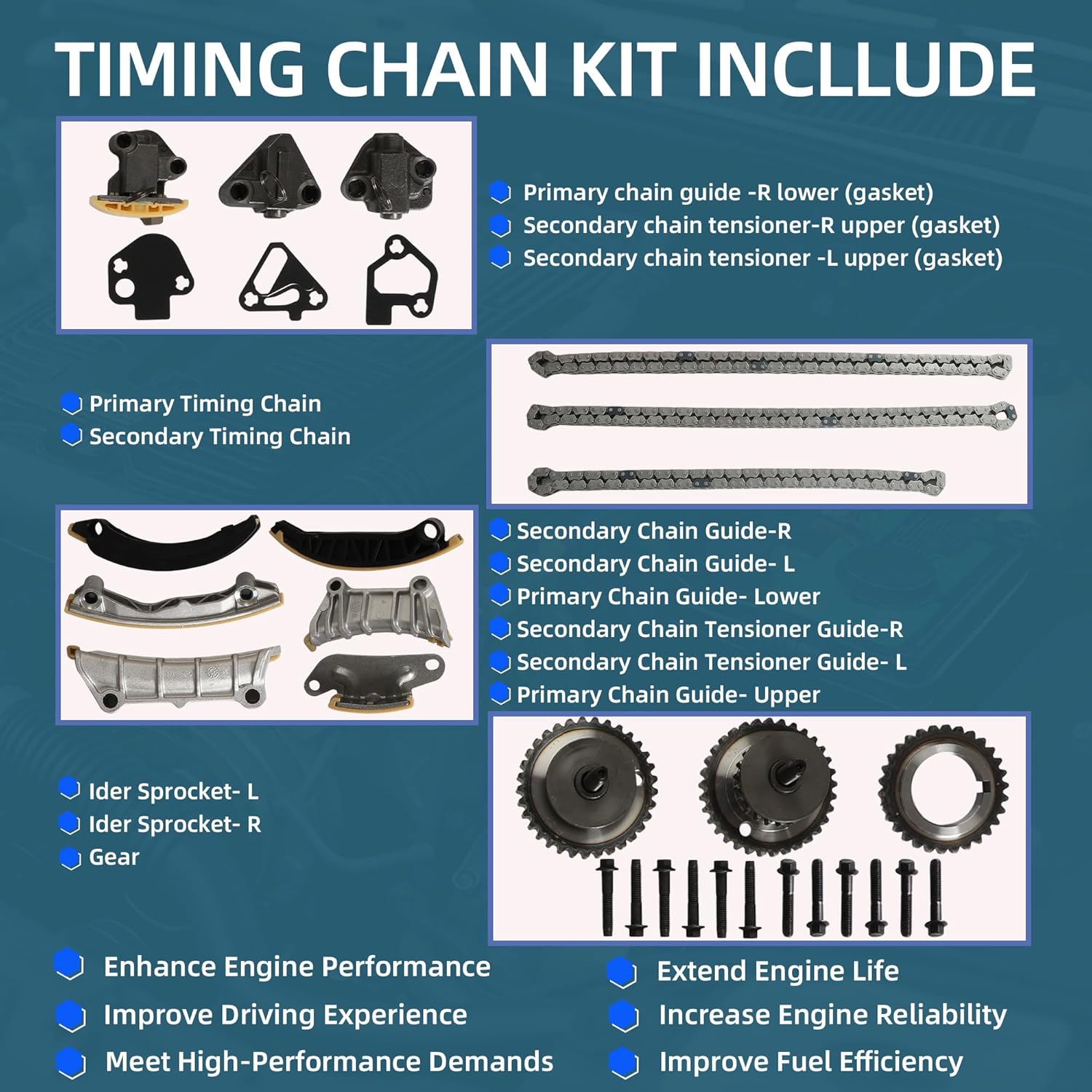 | Included Components | 1x Guide Rail Lower (primary Right Side Fixed) 1x Guide Rail Lower (primary Upper / Fixed) 1x Guide Rail Left Upper (secondary Tensioner Rail) 1x Guide Rail Right Upper (secondary Tensioner Rail) 1x Guide Rail Left Upper (secondary Fixed Rail) 1x Guide Rail Right Upper (secondary Fixed Rail), 1x Idler Sprocket (right Combo 22t / 33t) 1x Idler Sprocket (left Combo 22t / 33t) 1x Crank Sprocket (30 Teeth), 1x Tensioner Lower (primary - Crank To Idlers) 1x Tensioner Secondary (right Side Upper) 1x Tensioner Secondary (left Side Upper), 1x Timing Chain Lower (primary 96 Link), 2x Timing Chain Upper (secondary 114 Link), 1x Water Pump 1x Oil Pump |