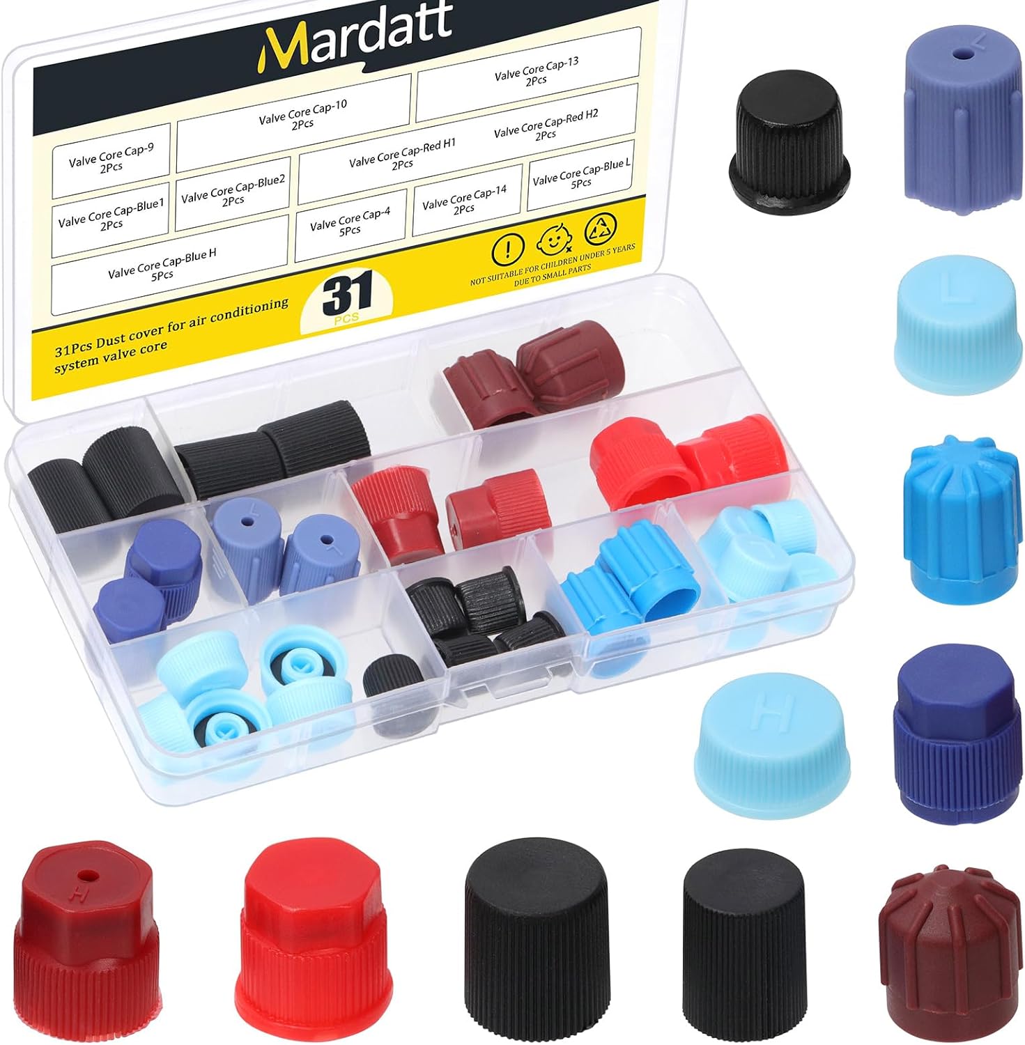 Mardatt 77Pcs R12 R134a AC Caps for Cars, 11 Sizes Car Air Conditioning Valve Cap, Auto Air Conditioning Service Charging Port Dust Cover, Sealed Recharge Valve Core Dust Cover Specification: 🔆 Product Type: Valve Core Dust Caps Kit 🔆 Size: As shown in the figure ♦️ Material: Plastic 🔆 Color: Blue, Red, Black, Brown ♦️ Quantity: 77pcs Why Choose Us? ✨ Durable: Our recharge valve core dust covers are crafted from premium-quality plastic, offering waterproof properties, resistance to damage, and excellent sealing performance. ✨ After-Sales Service: Should you have any queries regarding our products, please contact us promptly. We shall respond within 12 hours. ✨ Various Sizes: Our ac service valve cap assortment include a variety of sizes and ample quantities to meet your diverse requirements. Package Included: 77pcs ----- Valve Core Dust Caps