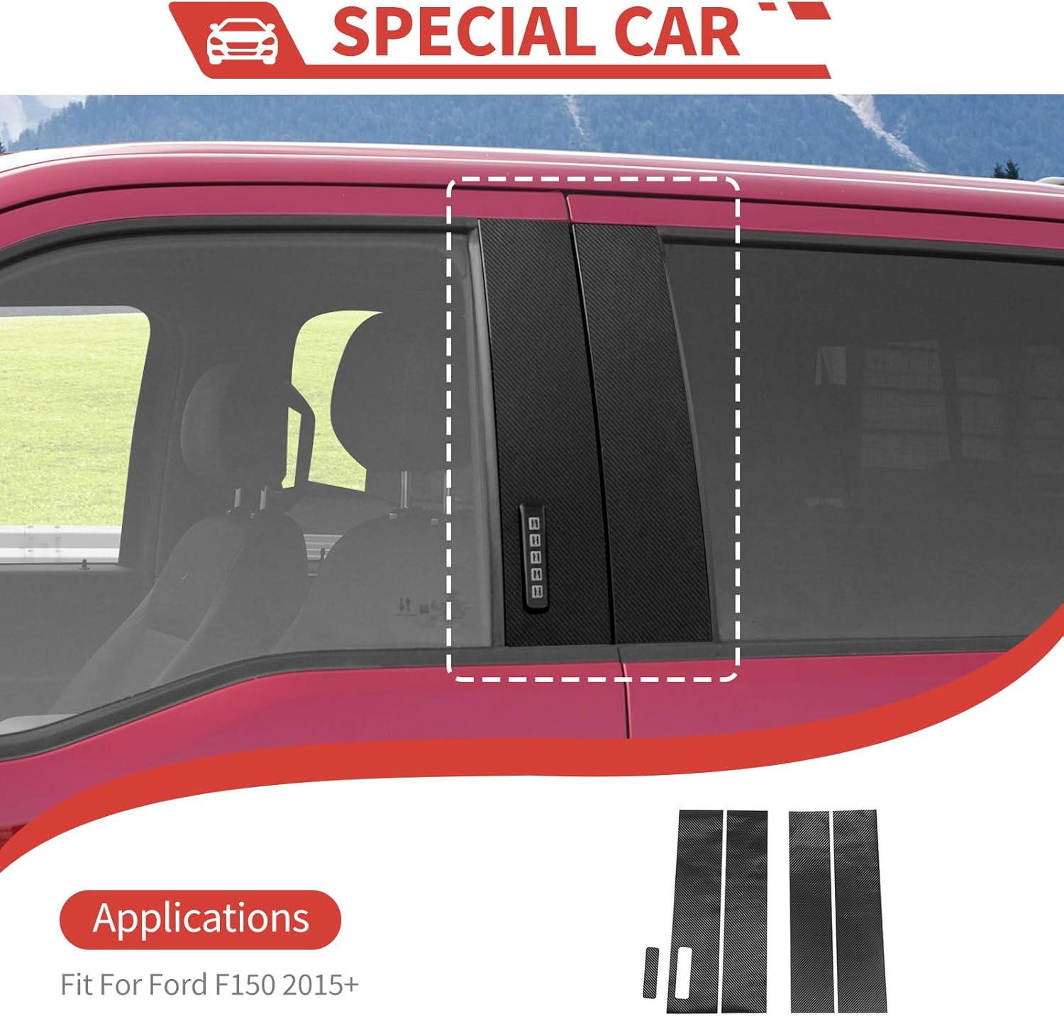 Fitment: -The black carbon fiber finish door window pillar posts trim kit exterior accessories fit for Ford F150 2015 2016 2017 2018 2019 2020 2021 2022 2023 2024 2025 2026 up. Please compare your car door window molding with our picture before ordering. The size is customized according to the original car, please check the model carefully and check the installation position of the car door window pillars b-pillar post in the product detail picture before purchasing to avoid buying the wrong one. Features: - Condition: 100% Brand New - Color: Black - Material: black car door window pillars b-pillar post decals protector decoration are crafted from high-quality carbon fiber material, does not fade, can perfectly integrate the style and color of the original kit. - Best gifts forF150 owners: Car door window pillar posts kit exterior accessories are designed with a cool and fashionable appearance, three-dimensional sense, glossy and bright, the curvature can perfectly fit the original cover, enhance the grade of the car, and enhance the sporty atmosphere of your car. - The exterior amayum car door pillar decals overlay protector kit can cover existing scratches and prevent your car from scratch and abrasion. Package Include: - Amayum forF150 Black Carbon Fiber Door Window Pillar Posts Decals *4