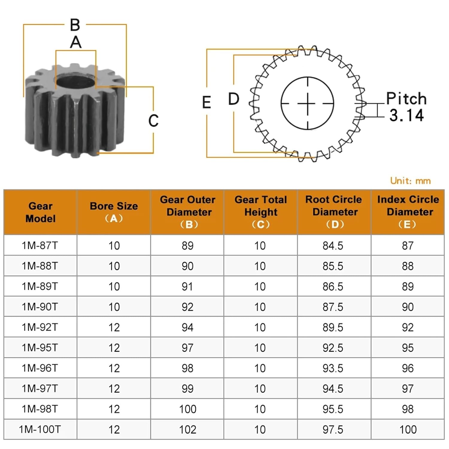 Drive GearDirection : Right HandPressure Angle : 20Processing : HobbingModel Number : 87T/88T/89T/90T/92T/95T/96T/97T/98T/100TTooth Profile : Spur GearMaterial : Carbon SteelShape : Cylindrical GearSurfac Treatment : Blackening