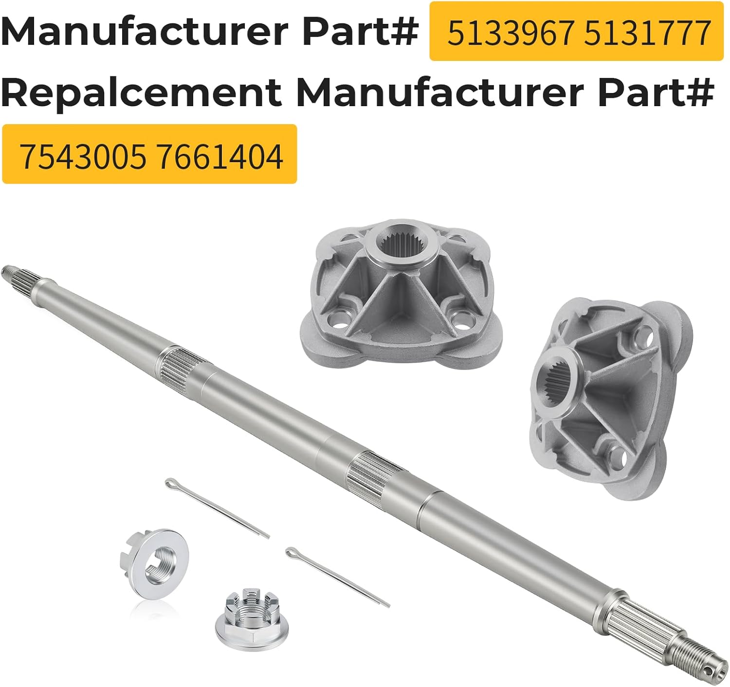 Manufacturer Part# 5133967 5131777 Replacement Manufacturer Part# 7543005 7661404 Package: Rear Axle Shaft x 1 Rear Wheel Hub x 2 Nut x 2 Pin x 2 Installation position:Rear Wheel Fit for Polaris ATV as follows Trail Blazer 250 2005-2006 Trail Blazer 330 2008-2013 Trail Boss 330 2005-2013 Scrambler 500 4x4 2005-2012