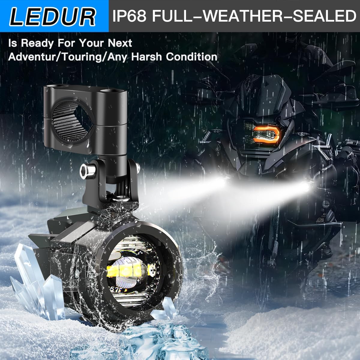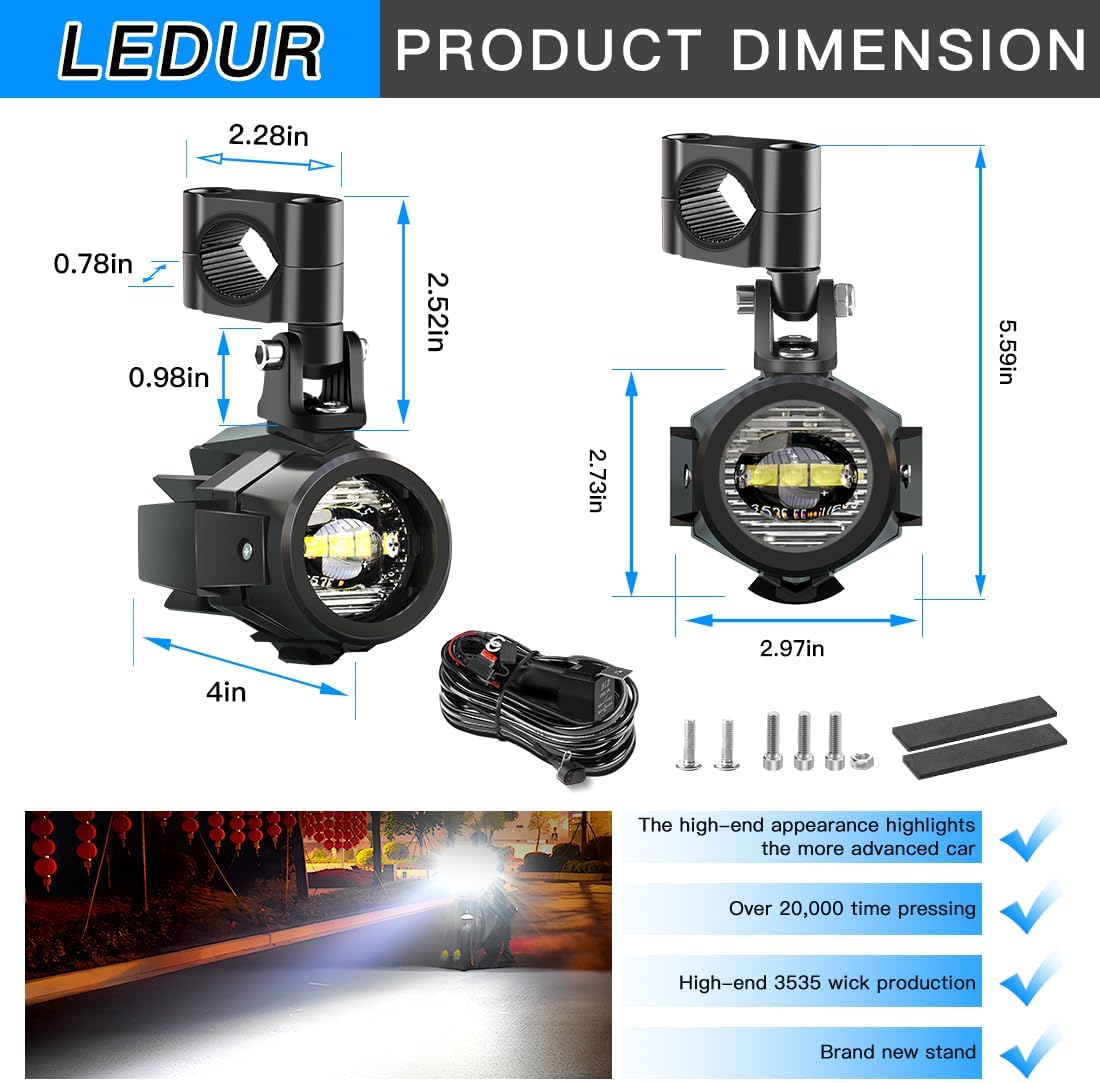 | Included Components | 1 x Switch Wiring Harness(Approx 10ft 16AWG,Plug and Play Connectors,2-Lead), 2 x LED Motorcycle Auxiliary Lights(40W/Pair), 2PCS Clamp Mounting Brackets(fits for 0.75"~1.0" O.D. tubes), Bolts & Nuts, Tools Kit,LEDUR Installation Diagram |