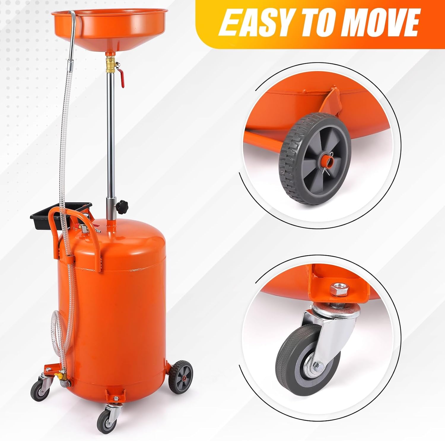 Waste Oil Drain Tank Air Operated Drainer Portable Oil Drain Container with Adjustable FunnelHighlights at a Glance:- Premium steel construction with powder-coated finish for enhanced durability and rust resistance.- Compact toolbox included for convenient storage of necessary tools.- Large tank capacity allows for efficient waste oil collection.- Funnel height is easily adjustable to accommodate various vehicle sizes.- Features a 15.2" funnel designed to minimize spills with its wide diameter.- Equipped with casters for 360-degree movement, providing effortless transport.- Comfortable ergonomic handle ensures easy operation.Specification:Tank Capacity: 8 gallon / 20 gallonFunnel Diameter: 15.2 inchesHeight Adjusts: 28-62 inches / 38-65 inchesHose Length: 15.7 inchesPacking List:1 x Portable Oil Drain Tank1 x Tool Box1 x Funnel1 x Pressure Gauge1 x Hose1 x User ManualFriendly Note:Do not exceed the oil drain container's rated capacity to prevent spills or damage.When not in use, store the oil drain container in a dry, safe location away from direct sunlight and extreme temperatures.