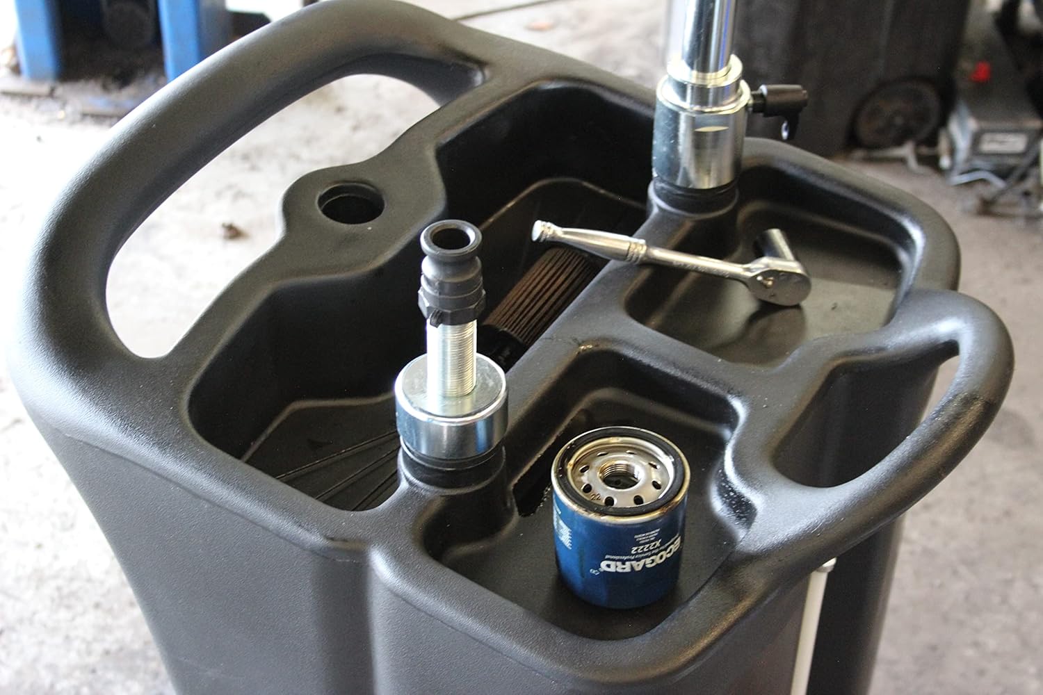 Portable upright drains are commonly used for collecting fluids under lift supported vehicles. A combination of two ball-bearing swivel casters and two fixed-axle wheels makes them portable and easy to maneuver. Pump-assist models feature a male camlock connector extending from the top of the reservoir for attaching to a fluid evacuation pump or other fluid transfer system . Model 3626 has a large 26 gallon (98 liter) reservoir molded from high-strength polyethylene for lighter weight, reduced corrosion and lower risk of damage to surrounding vehicles . Large recesses for tool and filter storage are molded into the top and drain directly into the reservoir. The large 18-inch (457 mm) offset bowl includes a removable metal filter screen and secondary debris screen.