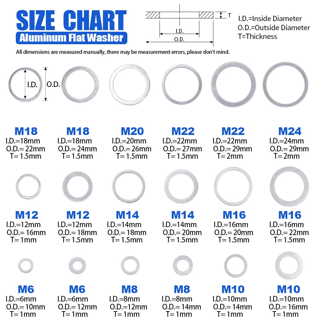 Glarks high quality automotive metric flat ring washer assortment set 【Specifications】: Product Type: Automotive metric flat washer Meterial: Aluminum Size: M6, M8, M10, M12, M14, M16, M18, M20, M22, M24 【Product Description】: ♣ Washers are made of aluminum, with corrosion resistant, durable for use and have a tighter seal than rubber washers ♣ Washer's surface are smooth can reduces friction between the fasteners, prevents leakage, isolates, prevents loosening or dispersion pressure ♣ This set include 18 different size total 470Pcs, various size and enough quantity for your use, very easy to install ♣ Perfect suitable for automotive or electrical applications such as oil lines, hydraulic fittings, oil drain 【Package Detail】: [ inner diameter x outer diameter x thickness: mm ] M6 x 10 x 1 ----------------- 45pcs M6 x 12 x 1 ----------------- 45pcs M8 x 12 x 1 ----------------- 45pcs M8 x 14 x 1 ----------------- 45pcs M10 x 14 x 1 --------------- 40pcs M10 x 16 x 1 --------------- 40pcs M12 x 16 x 1 --------------- 20pcs M12 x 18 x 1.5 ------------- 20pcs M14 x 18 x 1.5 ------------- 20pcs M14 x 20 x 1.5 ------------- 20pcs M16 x 20 x 1.5 ------------- 20pcs M16 x 22 x 1.5 ------------- 20pcs M18 x 22 x 1.5 ------------- 20pcs M18 x 24 x 1.5 ------------- 20pcs M20 x 26 x 1.5 ------------- 20pcs M22 x 27 x 1.5 ------------- 10pcs M22 x 29 x 2 --------------- 10pcs M24 x 29 x 2 --------------- 10pcs Total Quantity:470Pcs NOTE: Please check the size carefully before purchasing, thanks for your support!