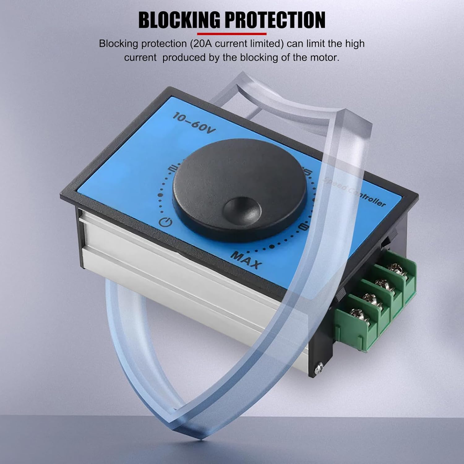 Specification: Input voltage: DC 10-60V (The specific voltage must be the same as the rated voltage of the motor) Output voltage: Linear output under load Current: 0-20A (Limited value 20A) Regulating type: regulating current Regulating method: potentiometer(270° linear) Regulating speed range: 0-100% Control frequency: 15KHZ Knob: 10K(with switch) Size: Approx. 9.6 x 6.1 x 3.4cm / 3.78 x 2.4 x 1.34inch Weight: 107g Package Included: 1 x DC Motor Speed Controller Note: The input terminal must be divided into positive and negative input. The input voltage must be the same as the rated voltage of the motor(within DC 10-60V). Can not input AC 220V, or it will burn up the module directly. Blocking protection is not a power cut, it is the limited current value of 20A. Please allow 1-3cm differences due to manual measurement. Thank you for your kindly understanding.