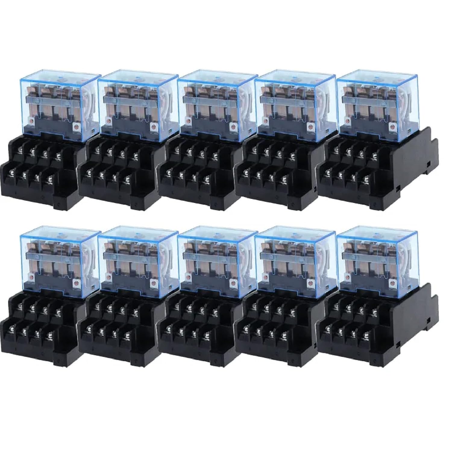 Transform your electrical control systems with this versatile LY4NJ power relay and socket base set. Each relay features a robust 4PDT (4 pole, double throw) configuration with 14 pins, offering 4NO and 4NC contacts rated for 10A at 240VAC. The relay supports multiple coil voltage options including 12VDC, 24VDC, 110VAC, and 220VAC, making it adaptable for various applications. Measuring approximately 1.6" x 1.1" x 1.4", this compact unit comes with an LED indicator for clear operational status monitoring. The package includes 10 complete sets of relays with matching PTF14A socket bases, designed for easy mounting on standard 35mm DIN rails. The silver contacts ensure reliable switching performance, while the epoxy protection adds durability. Perfect for industrial control panels, automation systems, and general-purpose switching applications where dependable performance is essential.