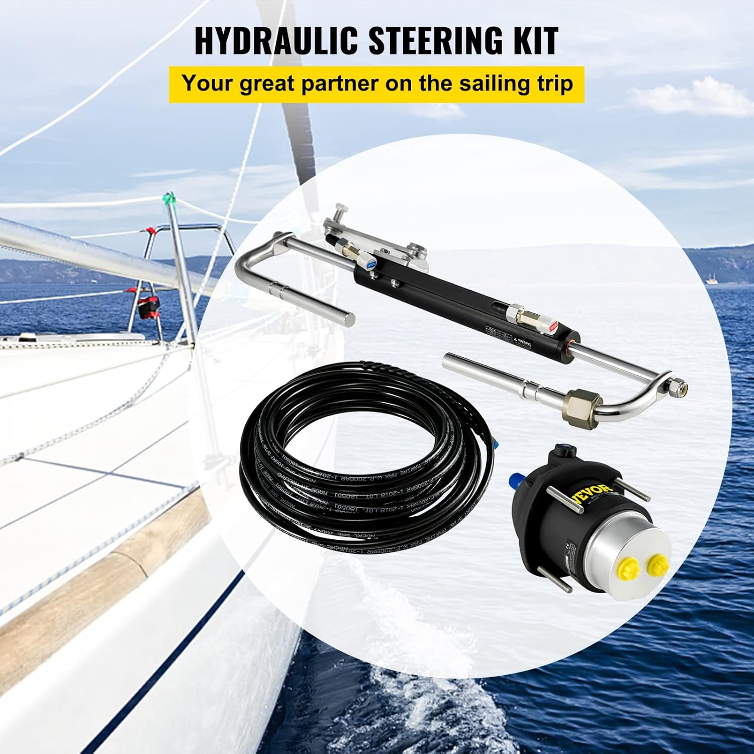 • 90 HP Hydraulic Steering Kit: The hydraulic outboard boat steering kit includes a balanced steering cylinder, a low-friction helm, one piece 20ft hose, and a fill kit. It will perfectly replace your aging or broken equipment and become a good companion for your sailing trips.