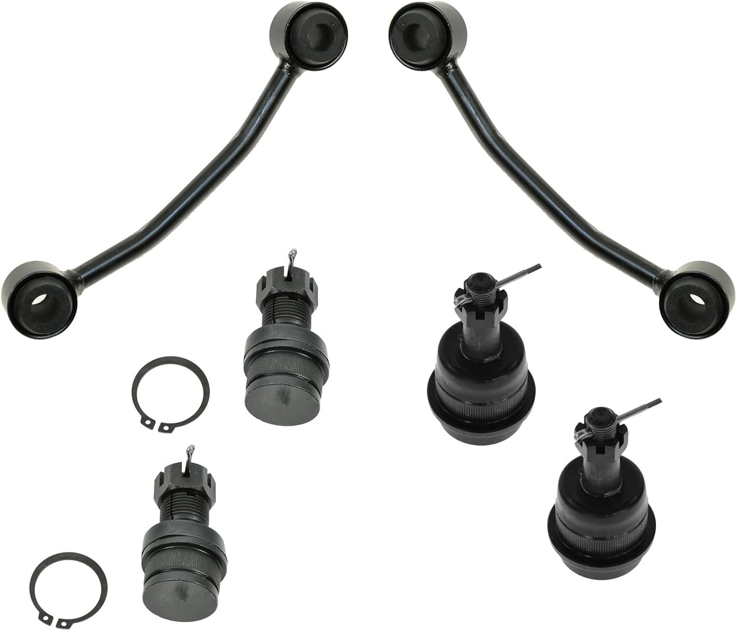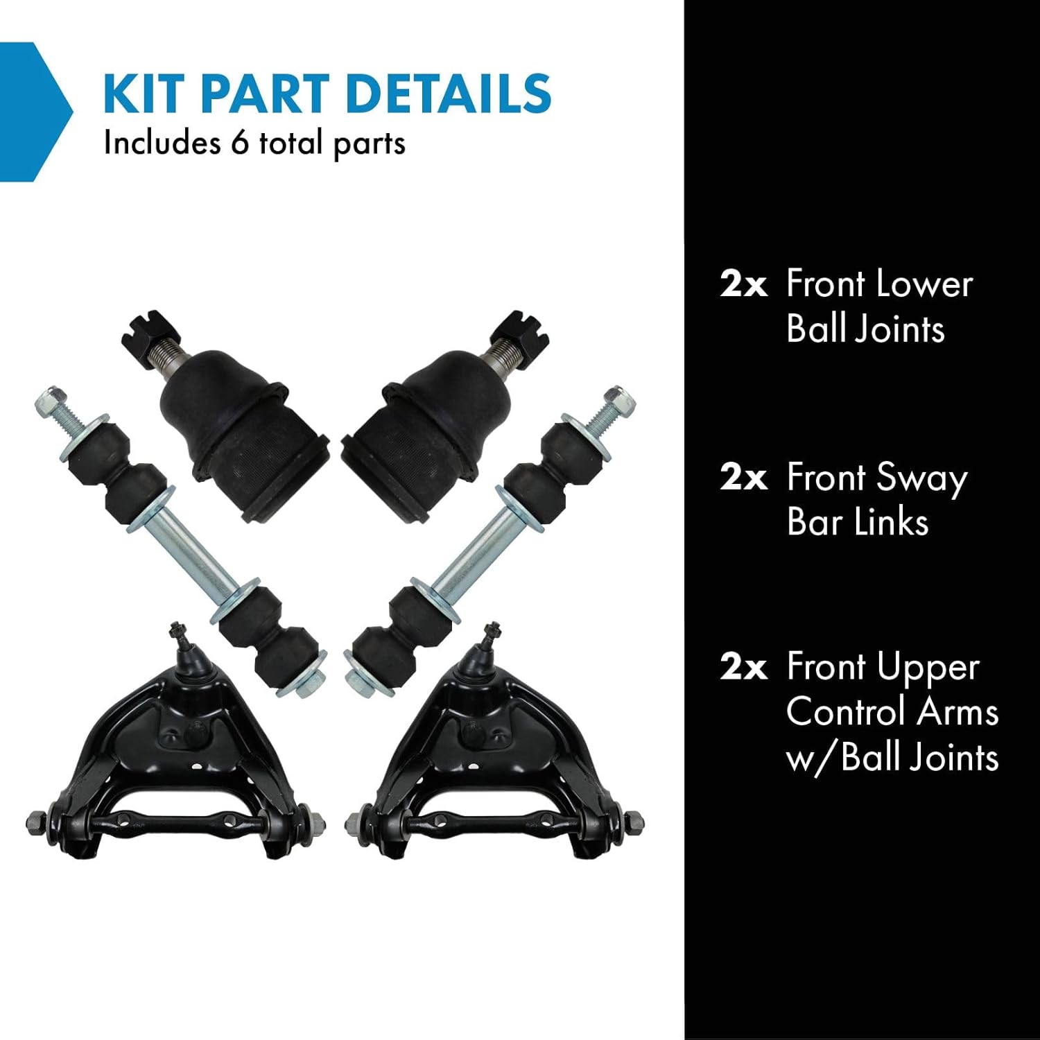 6 Piece Suspension KitKit Includes(2) Front Lower Ball Joints(2) Front Sway Bar Links(2) Front Upper Control Arms with Ball JointsFitmentDodge B100 1979-80 - Van excluding 4000LB GVW FrontDodge B150 1981-94 - excluding 4000LB GVW FrontDodge B1500 1995-98 - excluding 4000LB GVW FrontDodge B200 1979-80 - excluding 4000LB GVW FrontDodge B250 1981-94 - excluding 4000LB GVW FrontDodge B2500 1995-98 - excluding 4000LB GVW FrontDodge B300 1979-80 - excluding 4000LB GVW with 3,600lb Axle with Standard Suspension FrontDodge B350 1981-94 - excluding 4000LB GVW with 3,600lb Axle with Standard Suspension FrontDodge B3500 1995-97 - excluding 4000LB GVW with 3,600lb Axle FrontDodge Ram 1500 Van 1999-00 - excluding 4000LB GVW FrontDodge Ram 2500 Van 1999-00 - excluding 4000LB GVW with 3,500lb Axle FrontDodge Ram 3500 Van 1999-00 - excluding 4000LB GVW with 3,600lb Axle FrontPlymouth PB100 1979-80 - excluding 4000LB GVW FrontPlymouth PB150 1981-83 - excluding 4000LB GVW FrontPlymouth PB200 1979-80 - excluding 4000LB GVW FrontPlymouth PB250 1981-83 - excluding 4000LB GVW FrontPlymouth PB300 1979-80 - excluding 4000LB GVW with 3,600lb Axle with Standard Suspension FrontPlymouth PB350 1981-83 - excluding 4000LB GVW with 3,600lb Axle with Standard Suspension FrontProduct AttributesQuantity: 6 PieceProduct Features Application Specific Design: No modifications necessary Anti-Corrosion Coated: Enhanced surface life Pre-greased: No additional maintenance required Kitted for Restored Performance: Improved road-feel and handlingItem DetailsTRQ suspension kits are manufactured using premium raw materials and coatings for extended service life. Each TRQ suspension component is designed to be a direct, maintenance-free replacement to the stock unit. To extend the life of your steering and suspension components, TRQ recommends replacing components in pairs, sets, or kits. All products are fit and road-tested in our Massachusetts R&D facility to ensure we deliver on our promise of Trusted Reliable Quality.Reference Numbers06-8700118132260-5339260-534026053392605340265-2182265-2187386921242108724210872AB4210872AD4210872AE4210872R42108734210873AB4210873AD4210873AE4210873L42108744210874AB42108754210875AB4219873AD432240445D110445D110545G008146G0081A502-1104502-1105511-00875L511-00875R5134384AA5134385AA514384AA520-315520-316535-920545-1081545-1081B5451081B545108460332536034028606.67027687001872R873LCA366BCA381BCAK620315CAK620316CB25037CB25038CB81157CB81157PRCB81158CB81158PRCK620315CK620316CMS20380CMS20381DG5451081FA4212FA4213FCA820FCA821GS20380GS20381JTS692K620315K620316K7025K7298K8097MK7025MK7298MS20380MS20381R260107RK620315RK620316SK7298SK7298PRSL237SUS00323SUS05055SUS05056SUS06785