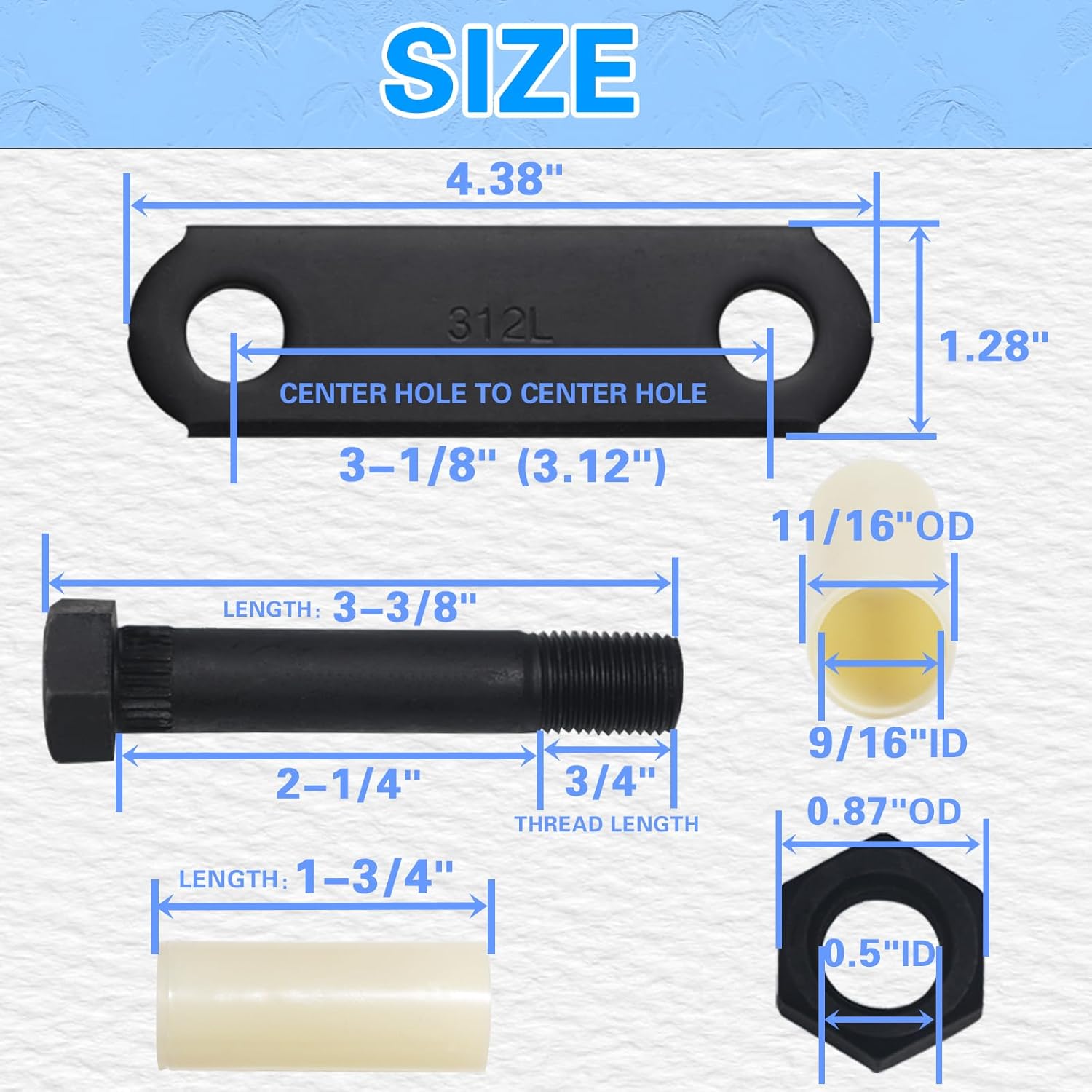 | Included Components | 14Pcs 9/16"-18 Self Locking Nuts, 14Pcs 9/16"-3 x 3" long Shackle Bolts, 8PCS Nylon Bushings with an inner diameter of 9/16", 8Pcs Shackle Straps with a center hole spacing of 3-1/8" |