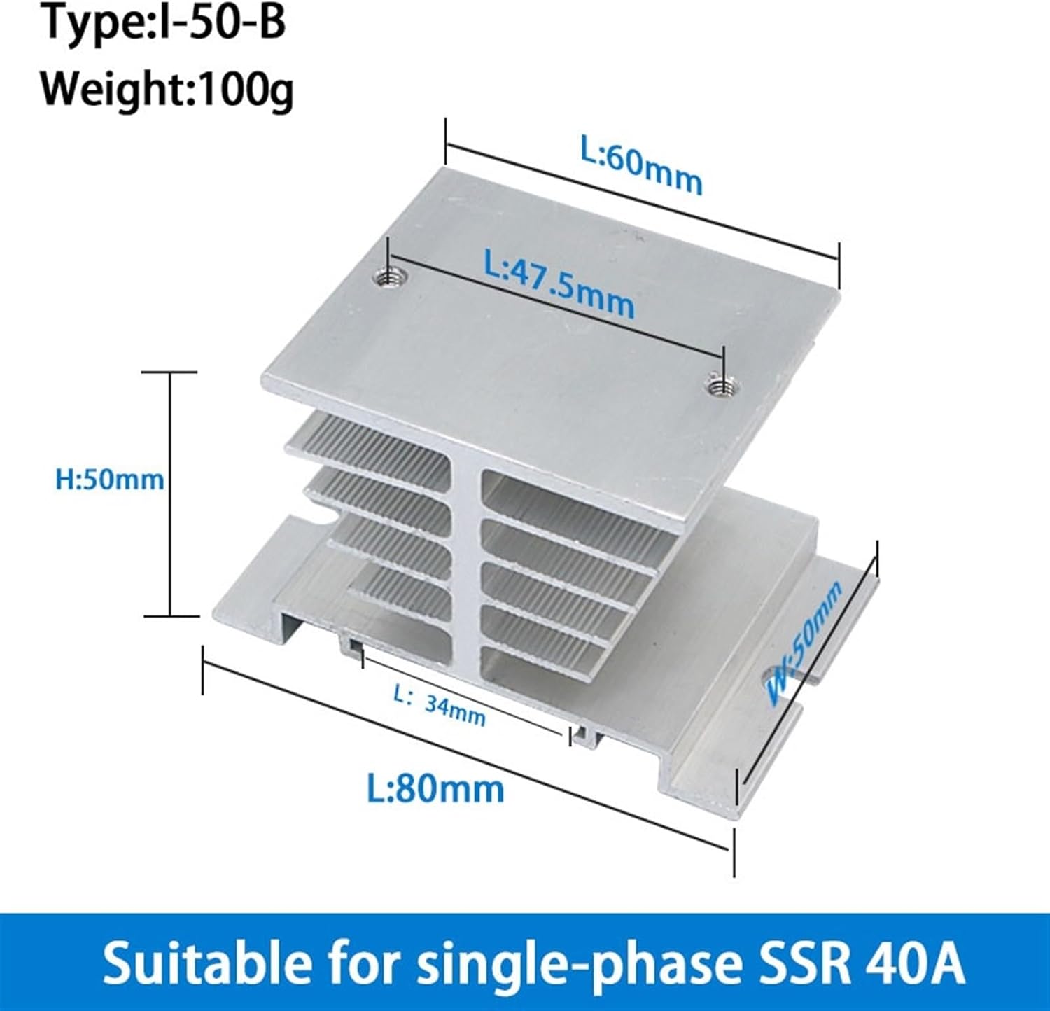 Heat sink for single phase solid state relay 10-40AGrade AluminumTemper O-H112Application Heat SinkShape SquareAlloy Or Not Non-alloyModel Number I-50SSR Current 10-40A Size(L*W*H) 80x50x50mmWeight 100g