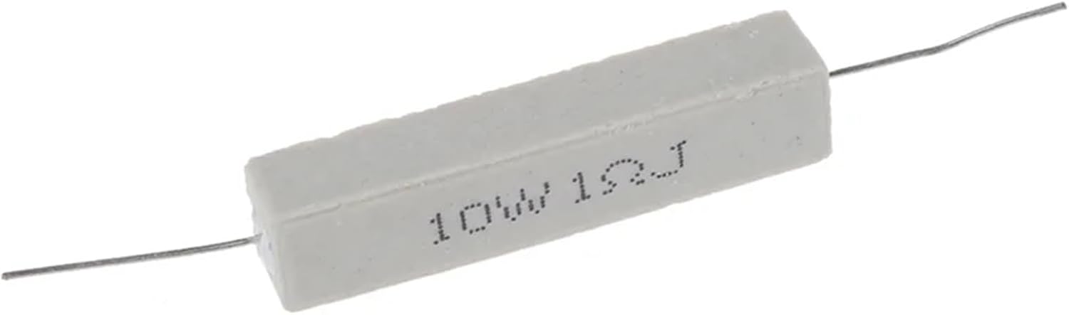 Resistor Units20 Pcs Wirewound Cement Resistor 1 Ohm 5% 10W Watt Product Name : Cement Resistor;Body Material : Cement;Power : 10WResistance : 1;Tolerance : +/-5%Body Size (Approx.) : 49 x 10 x 9mm/ 1.9 Inch x 0.39 Inch x 0.35 Inch (L*W*H);Lead Diameter (Approx.) : 0.8mm/ 0.031 InchLead Length (Approx.) : 27mm/ 1.06 Inch (Each end);Color : Whit eWeight : 114g/SETCement Resistor features good heat resistant, low temperature coefficient, high load power, high insulating capacity.Wire Wound Cement Resistor with solderable axial lead for easier mounting.Widely used in computer, TV set, apparatus, meter, sound and other equipment.Package Content : 20 x Cement ResistorsOnly the above package content, other products are not included.Note: Light reflection and different displays may cause the color of the item in the picture a little different from the real thing. The measurement allowed error is +/- 1-3cm.==========Material : ceramics, cementSpecification 1 : ResistorSpecification 2 : Aluminum Shell ResistorSpecification 3 : ResistorsSpecification 4 : Resistance ofSpecification 5 : The resistance