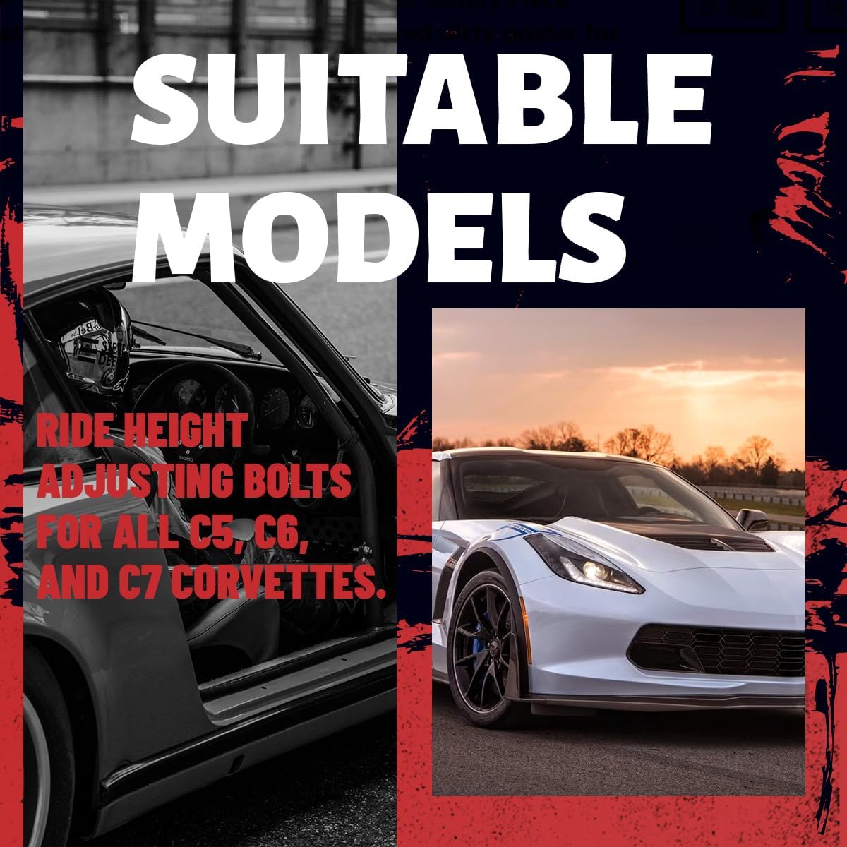 Applicable modelsAdjusting bolts Fitment:- for C5 Corvette - 1997 1998 1999 2000 2001 2002 2003 2004 (Front Only) - for C6 Corvette - 2005 2006 2007 2008 2009 2010 2011 2012 2013 (Front & Rear)- for C7 Corvette - 2014 2015 2016 2017 2018 2019 (Front & Rear)Replacement Ride Height Adjusting Bolts - Direct Bolt for Corvette C5, C6, C7 Function of replacement partsRide height adjustment bolt size is suitable for Corvette, used to adjust the height and improve your driving comfort.Application scenariosSolve your for Corvette C5, C6, C7 problemsMaterialRubber and SteelPackaging contains4 Pcs Ride Height Adjusting Bolts