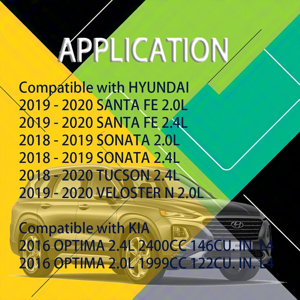 Application: Compatible with Hyundai Santa Fe 2.0L 1998Cc 122Cu. In. L4 Dohc Turbocharged 2019 - 2020 Compatible with Hyundai Santa Fe 2.4L 2359Cc L4 Dohc 2019 - 2020 Compatible with Hyundai Sonata 2.0L 1998Cc 122Cu. In. L4 Dohc Turbocharged 2018 - 2019 Compatible with Hyundai Sonata 2.4L 2359Cc L4 Dohc 2018 - 2019 Compatible with Hyundai Tucson 2.4L 2359Cc L4 Dohc 2018 - 2020 Compatible with Hyundai Veloster N 2.0L 1998Cc 122Cu. In. L4 Dohc Turbocharged 2019 - 2020 Compatible with Kia Optima 2.4L 2400Cc 146Cu. In. L4 2016 Compatible with Kia Optima 2.0L 1999Cc 122Cu. In. L4 Turbocharged 2016 Compatible with Kia Optima 2.4L 2359Cc L4 Dohc 2016 - 2020 Compatible with Kia Optima 2.0L 1998Cc 122Cu. In. L4 Dohc Turbocharged 2016 - 2020 Compatible with Kia Sorento 2.0L 1998Cc 122Cu. In. L4 Dohc Turbocharged 2016 - 2018 Compatible with Kia Sorento 2.4L 2359Cc L4 Dohc 2016 - 2020 Compatible with Kia Sportage 2.0L 1998Cc 122Cu. In. L4 Dohc Turbocharged 2017 - 2020 Compatible with Kia Sportage 2.0L 1999Cc 122Cu. In. L4 Dohc 2017 - 2020 Compatible with Kia Sportage 2.4L 2359Cc L4 Dohc 2017 - 2020