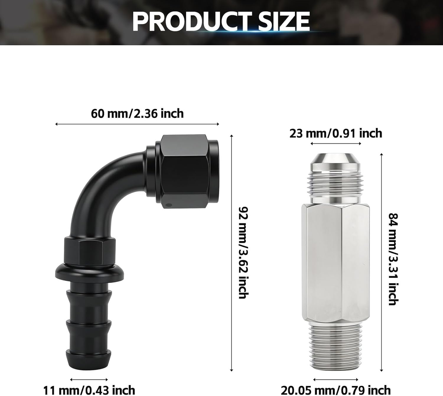Specification: Note: The sealing tape color is random (blue and pink). Fit for: RAM 2500/3500/4000/4500/5500 6.7L 2007-2024 Replacement Part Number: 52014739AG, 55056711AC, 55056966AA, 68005253AA Color: Silver & Black Material: Stainless steel Thread Size: Inlet: 1/2-14 NPT, Outlet: 10AN Package Contents: 1 x Stainless steel connecting pipe 1 x 90°AN10 1 x Clamp 1 x Raw tape