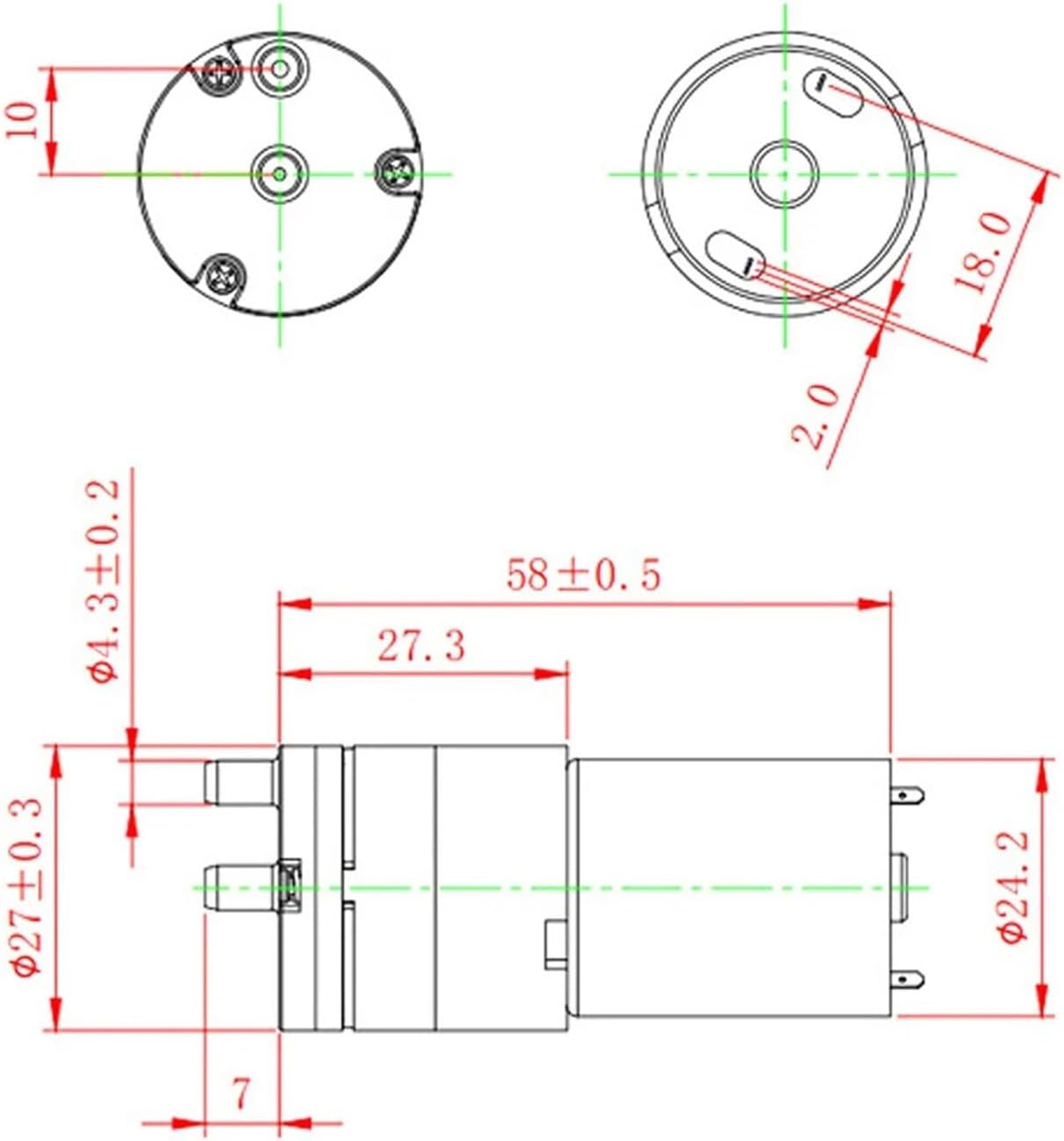 Pump & Motor AssembliesProduct name: Micro vacuum pump motorRated voltage: 3.7VRated current: less than or equal to 800mA (3.7V)Power: 2.4WAir nozzle diameter: 4.2mmPressure: greater than or equal to 60KPa (450mmHg)Vacuum flow rate: 0.5 - 2.5L/min (LPM)Noise: less than 60db (30cm distance)Life test: greater than or equal to 50,000 times (ON 10s, OFF 5s)Inflation time: Less than 10 seconds (0 to 300mmHg in 500cc tank)Color: Silver