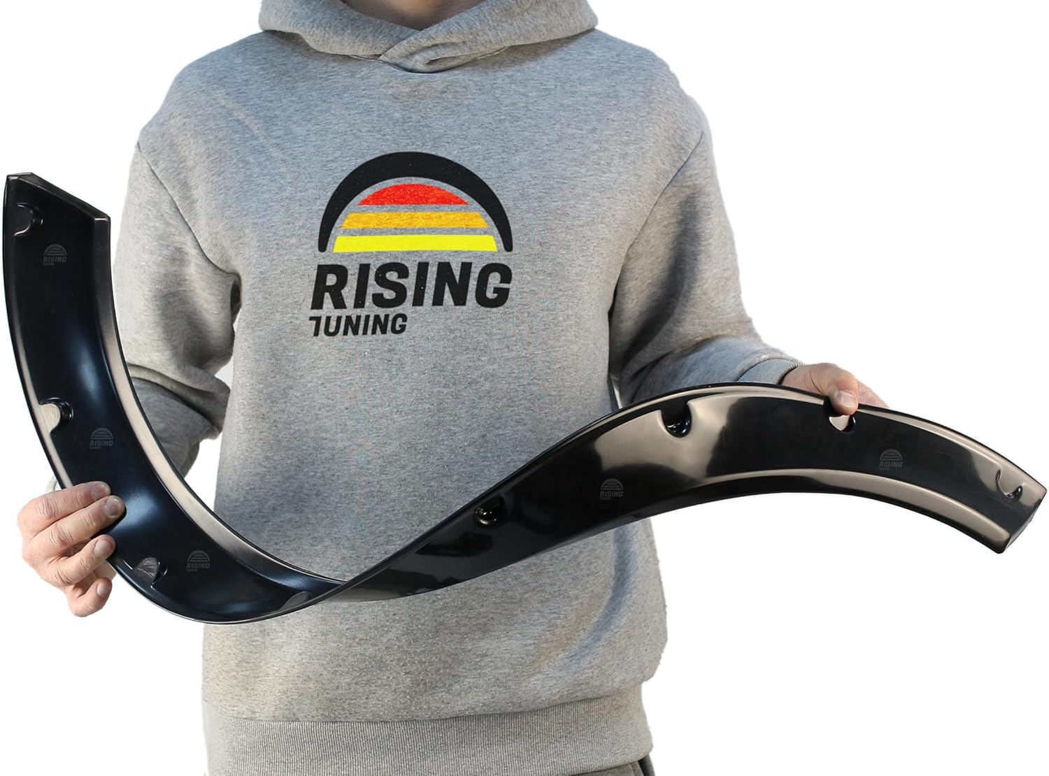 Presenting you the high quality universal JDM SPLASH arch extenders, this model will allow you to increase the width of the wheel arches by +5 centimeters (+2 inches). Model is made of unique car ABS plastic with unique characteristics intended for severe non-standard conditions, such as auto sport, such as drifting, time trial race and off-road race where the contact of environment with a car is inevitable. The material used for the Splash fenders by Rising Tuning are highly tension and tear resistant but the arch extenders retain their original shape and elasticity. We use a material thickness of 3mm - and in the reinforcement points where the stiffeners run, the thickness goes up to 4mm. We use different production technology for different model families. A set of two 5 cm (~ 2 inches) wide fender flares made of high-quality 3mm thick ABS plastic in the Modern style. Your original fender flares andor quarter panels must be drilled and cut to be installed on your car. Our overfenders can be installed on rivets or bolts – you will need to drill your stock fenders and quarter panels. The product is lightweight and can be installed without affecting the weight of your car. May be blended in with your car body or left with open rivets. There may be small scratches on the plastic, as the product is delivered as "to be painted", but can be used as is. Surface finish: Black glossy. This is a universal product (The flares can fit on many customized models. Make sure the dimensions of the flares match your wheel well opening) Heat up the flares with a heat-gun and install them to follow the car body lines.Item content: Universal JDM Splash Fender Flares with Abs plastic - 2pcs.*Fenders may have micro scratches no more than 30 microns deep. This is due to the production technology and does not affect the final result. The product is completely ready for painting and after applying the primer you will have a perfectly flat surface, do not worry about scratching the product during fitting, the material has great resistance to impact and plasticity. Before painting you can heat the fenders and the micro scratches will shrink.Material of "SPLASH" Fender flares: Different materials are used for manufacturing car tuning elements, the beauty, practicality and durability of the parts depend on their properties. To make you satisfied with the results, Rising Tuning manufactures and procures car parts including ABS plastic, a polymer that differs favorably from other materials. This plastic demonstrates increased impact resistance, in which it surpasses styrene copolymers - polystyrene. This material is also characterized by mechanical stiffness and strength, wear resistance and resistance to deformation and melting in short-term heating up to 100 degrees Celsius. At temperatures up to 70-80 degrees Celsius, products made of this polymer can be used for a long time without their qualities deteriorating and while maintaining dimensional stability. These properties allow to use ABS plastic for manufacturing of the most various elements of car bodyAdvantages of ABS plastic: Optimal combination of shock resistance and elasticity provides longevity of the products. Under light torsion loads plastic elements restore their original shape without residual deformation. High dimensional stability which allows manufacturing of complex molded products with high accuracy. Good adhesion to paint materials, which allows them to paint products in any desired color.A brief installation instruction (self-installation): *Before installing the expansions you need to prepare the car and make a fitting. We strongly recommend contacting professionals to install the fenders. This process is not simple and requires above-primary skills.1. Apply the arch extenders to the body of the car. You can use masking tape to try on the arch extenders simply by attaching them to the body and inspect the future visual appearance of your car 2. Once you understand that the position of the fenders are correct and this is their best position - finally tape them down and make marks on the body with an erasable marker. This is to see if the fender has changed position when installed. 3. After all measurements are made, remove the arches from the body and cut out some of the body fenders that will interfere with the installation and the wheel of your car. Install the fenders and use a construction hair dryer to shape them to the car's body lines-just press the extensions against the car body. ABS plastic has a memory and when heated becomes malleable. 4. After the main part of the fitting is done, step by step make holes in the arches and the body and press the arch to the body, in parallel you can use a hair dryer so that the extensions clearly repeat the shape and press it with