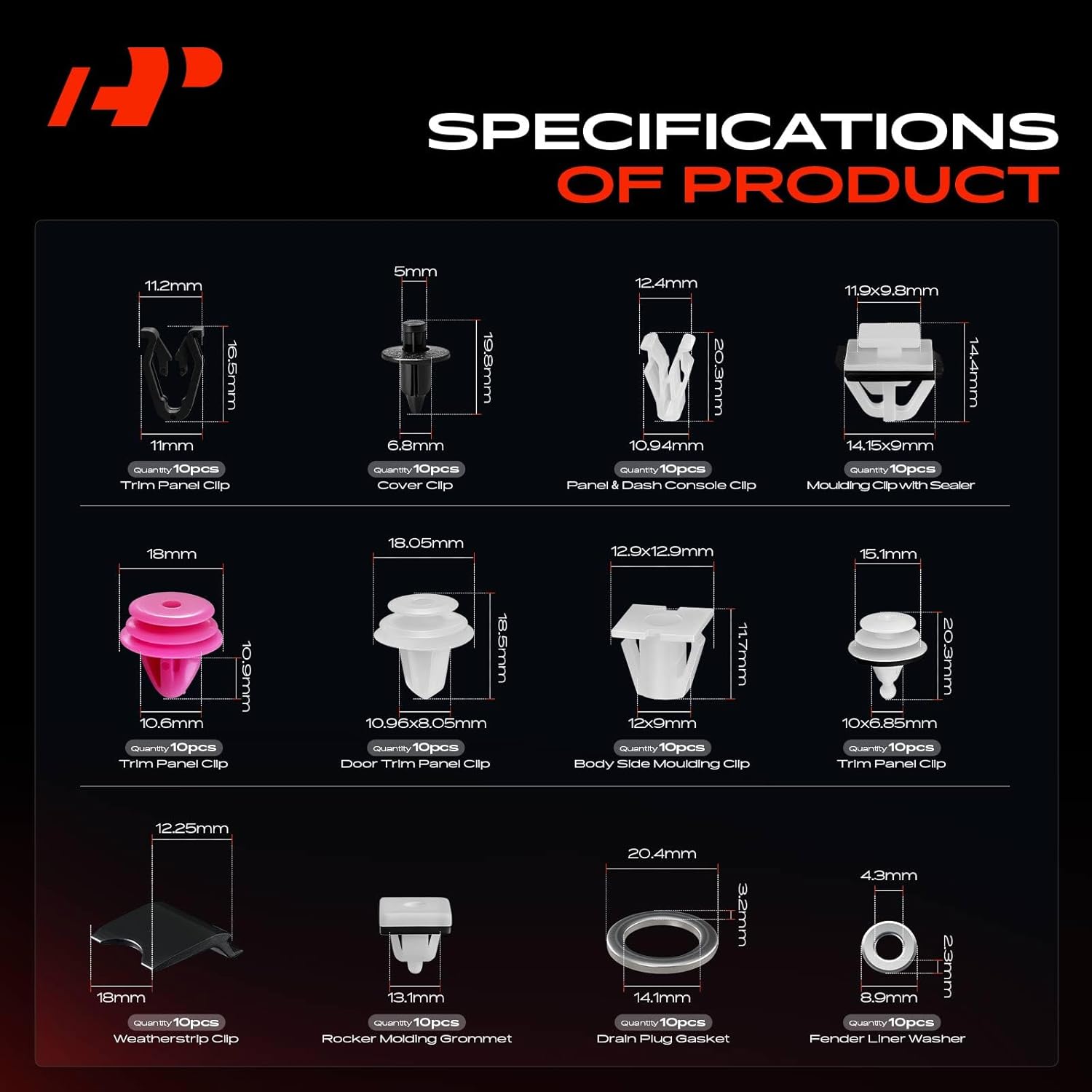 | Fastener Type | Push-Type Retainer, Nylon Nut, Clip, Screw, Retainer, Washer-Plain |