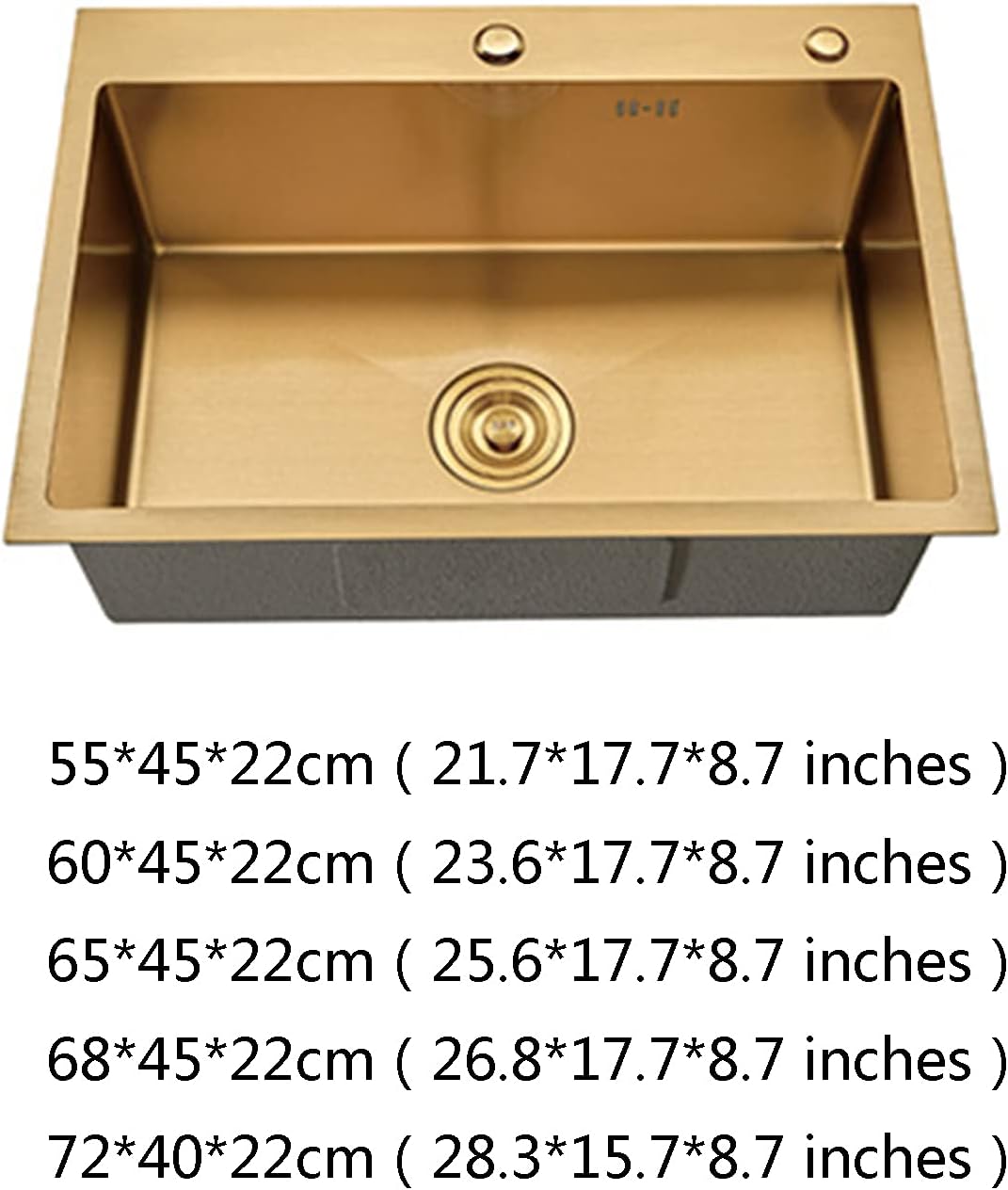 The kitchen sink, made of SUS304 stainless steel, has a smooth surface and is easy to clean. The smooth corners and hand-polished edges allow you to easily clean most cooking utensils. It can be used in kitchens, balconies, garages, RVs, workbenches, etc. Product name: kitchen sink Material: Stainless steel Shape: rectangle Color: golden Size: 55*45*22cm (21.7*17.7*8.7 inches) 60*45*22cm (23.6*17.7*8.7 inches) 65*45*22cm (25.6*17.7*8.7 inches) 68*45*22cm (26.8*17.7*8.7 inches) 72*40*22cm (28.3*15.7*8.7 inches) Packing: sink, drainage set, telescopic basket. soap dispenser.