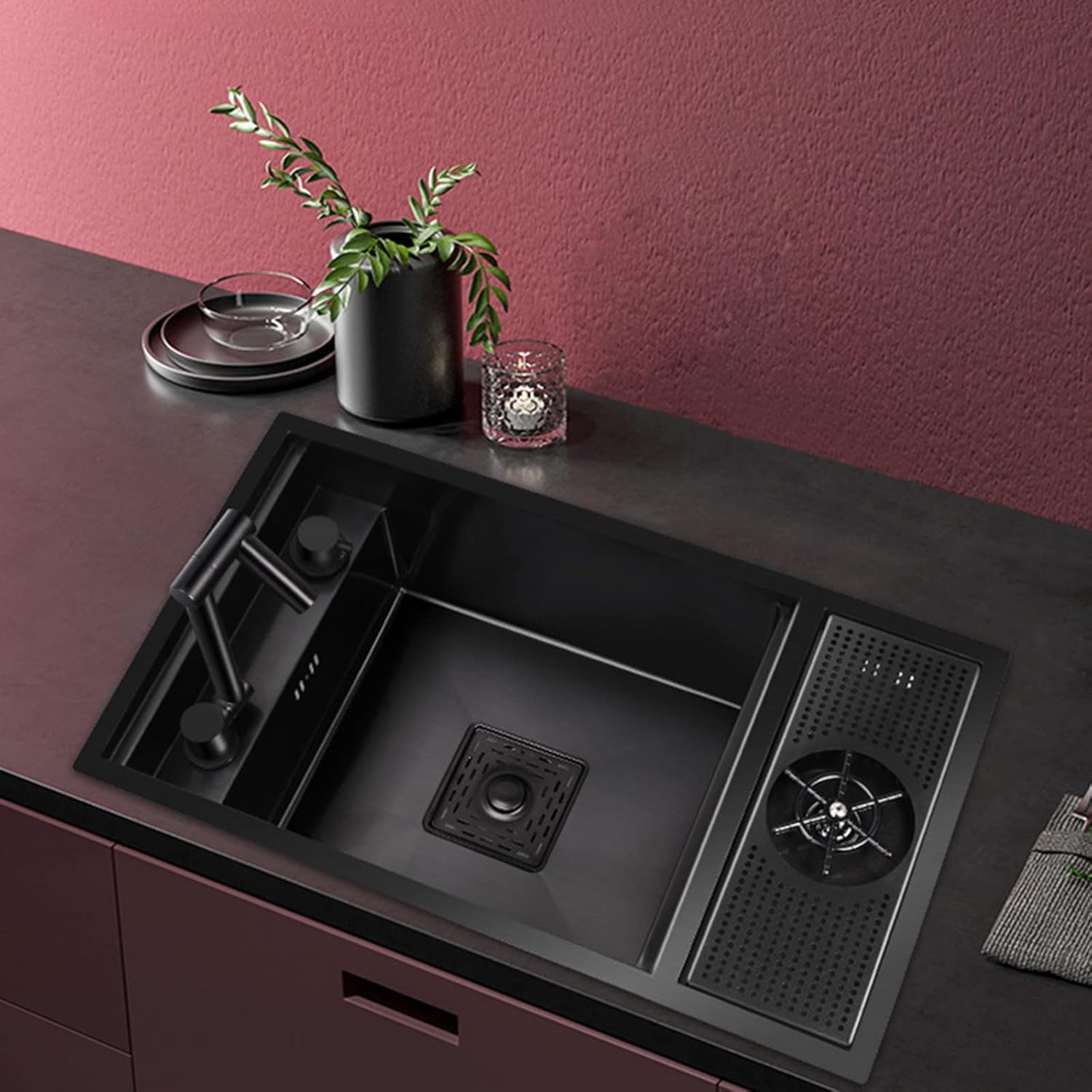 Bar sink with glass rinser. The has 5 spray holes. The powerful hydraulic power can completely rinse the residue in a few seconds. The stainless steel sink has a nano-brushed surface and is easy to clean. It is suitable for diameters of 1-4 inches. All kinds of cups, suitable for any bar, cafe, restaurant, bar, family. Product name: kitchen sink Applicable scenarios: balcony, garage, RV, workbench Material: 304 stainless steel Number of bowls: single bowl Shape: rectangle Colour: Black Size: 55*32cm/21.7*12.6 inch, 60*40cm/23.6*15.7 inch, 70*40cm/27.6*15.7 inch Products include: 1*Sink 1*Drainage components 1*Glass Rinsing 1*Cover 1*Water inlet pipe 1*Angle valve