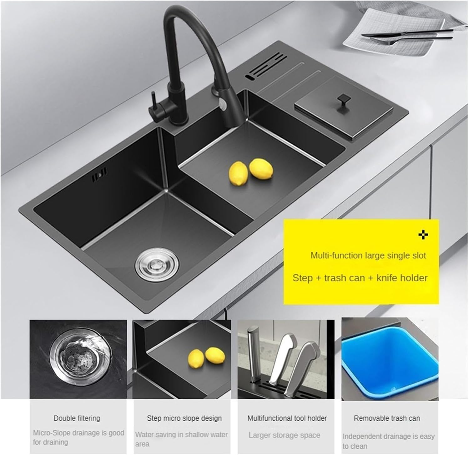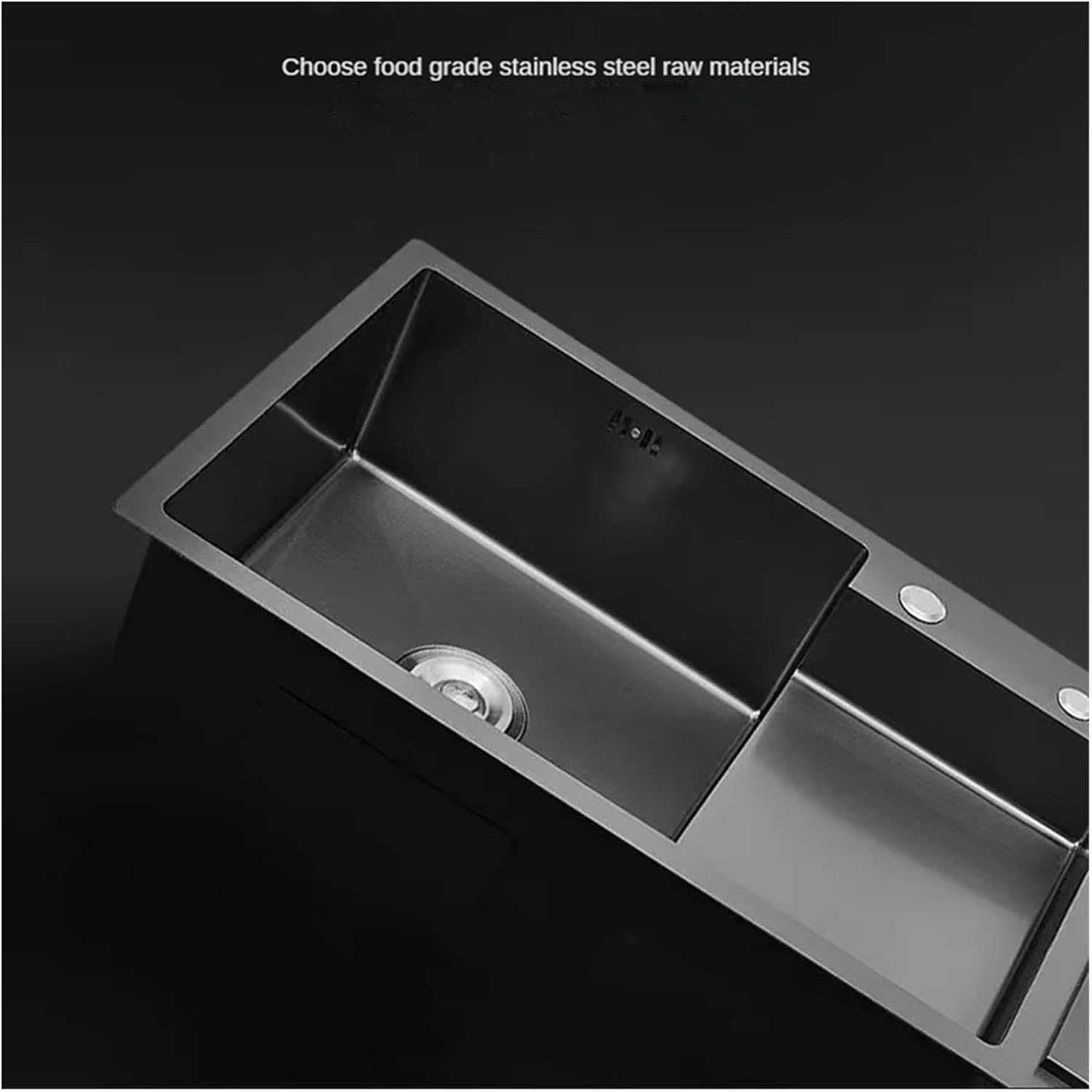 Kitchen SinksMaterial: stainless steelArticle number: Single slot garbage binThickness: 3.0MMForming process: manual processOpening size: 89 * 42Slot depth: 22 treatment: layerModel: Large single slot with trash canNet weight: 18Color: black