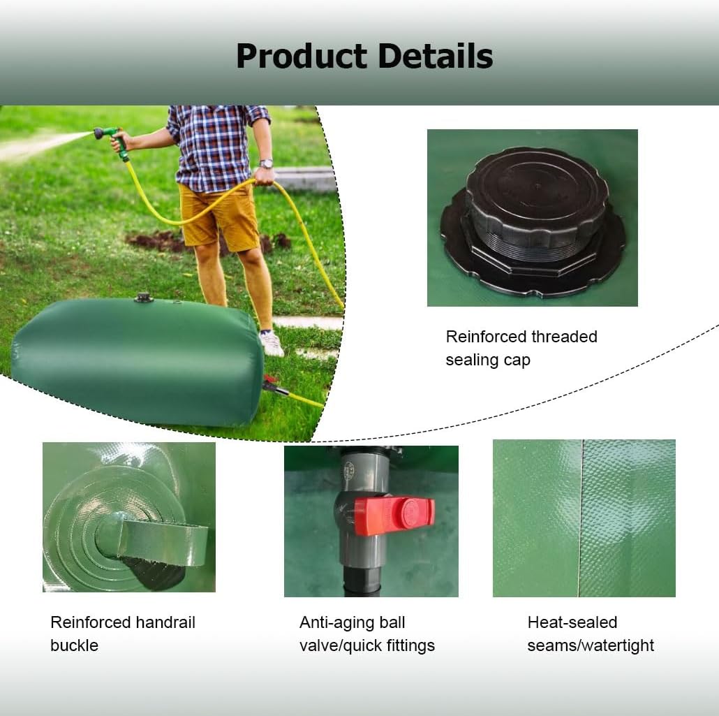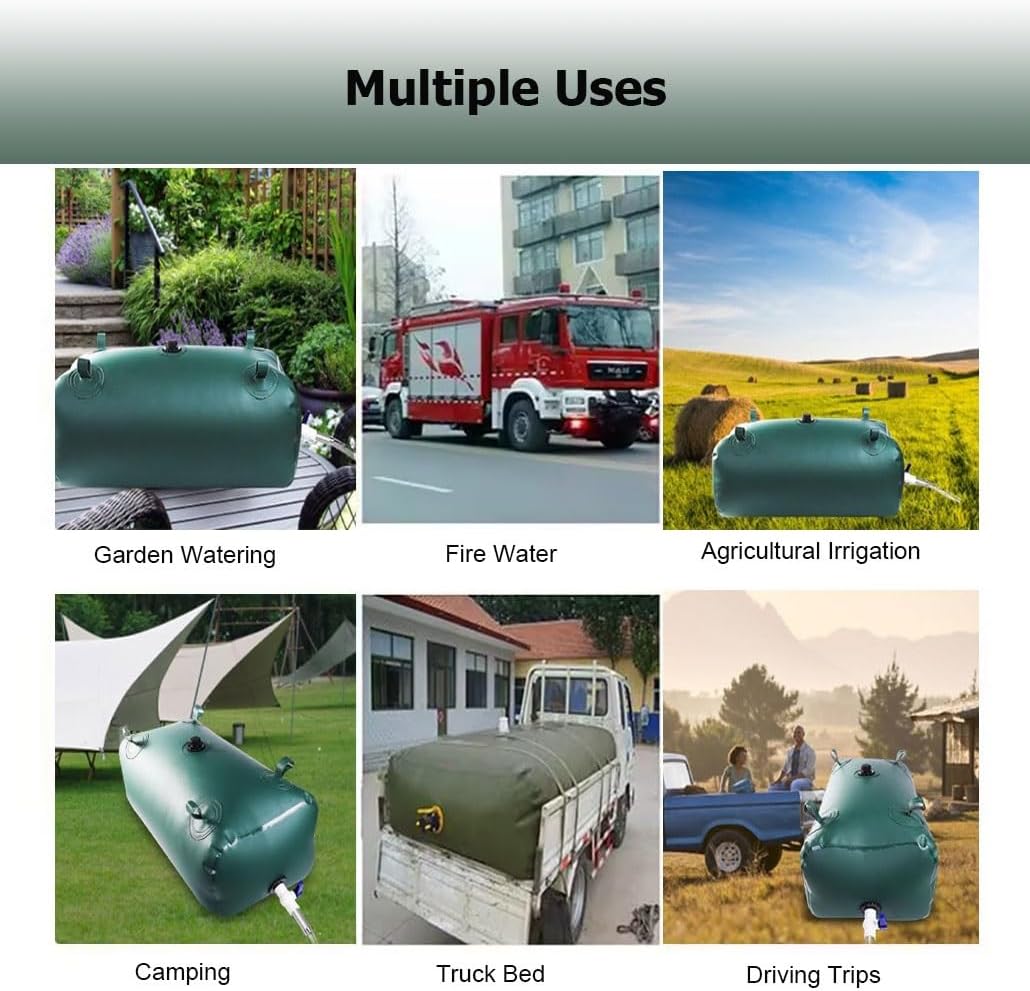 Are you still worried about finding a large-capacity water storage container? Our foldable portable water tank does not take up too much storage space, but can help you solve water emergencies in various occasions; you can use it for drought relief, agricultural irrigation, camping, RV travel, firefighting, bridge preloading, sewage treatment, etc.Specification:Name: Water Bladder TankMaterial: PVCColor: GreenAdaptation Temperature: -50~+60℃Outdoor Life: 8~10 yearsCan Be Filled With Boiling Water: NoUses: Drought resistance, fire prevention, emergency waterFeature:1. Emergency water bag is designed with a proper water spout2. Water storage bladder containers is lightweight and foldable, space-saving3. The stored water has no risk of transpiration4. Small size, light weight, easy to transport and transfer5. Water storage bladder is made of waterproof PVC material6. Water bladder tank has strong anti-climate ability7. Water bag can be reused for a long time8. Suitable for: campervan, pickup truck, van, camping trailer, Rv, truckHow to maintain?1. For continuous use, please clean every 15 days2. When the water is full, if you need to move it, be sure to secure it firmly and keep it away from objectsPackage Includes:1 × Water Storage BladdersNote:1. Due to manual measurement, there may be 1-3 cm error2. The color may exist a slight difference due to different screen displays