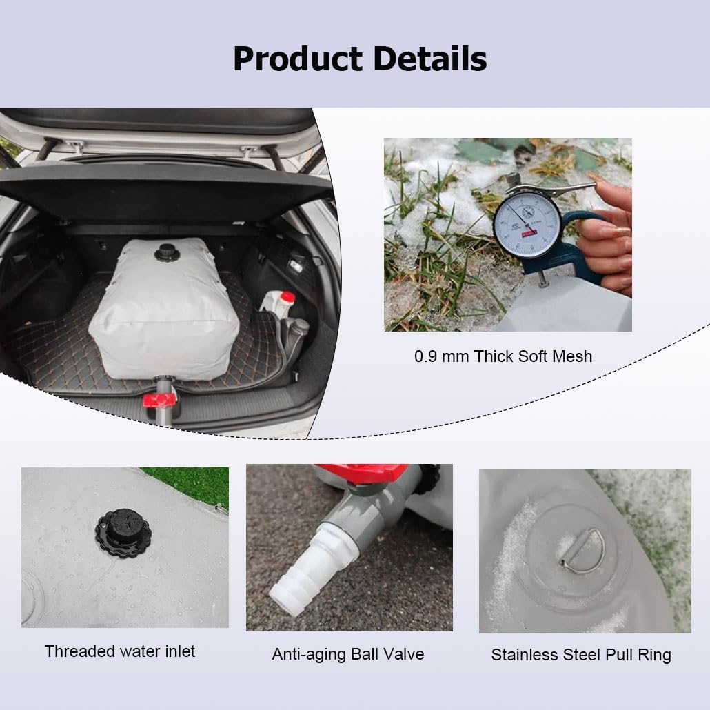 Our food grade foldable portable water tank does not take up too much storage space, but can help you solve water emergencies in various occasions; you can use it for drought relief, agricultural irrigation, camping, RV travel, firefighting, bridge preloading, sewage treatment, etcSpecification:Name: Water Bladder TankMaterial: PVCColor: GrayAdaptation Temperature: -50~+60℃Outdoor Life: 8~10 yearsCan Be Filled With Boiling Water: NoUses: Drought resistance, fire prevention, emergency waterFeature:1. Emergency water bag is designed with a proper water spout2. Water storage bladder containers is lightweight and foldable, space-saving3. The stored water has no risk of transpiration4. Small size, light weight, easy to transport and transfer5. Water storage bladder is made of waterproof PVC material6. Water bladder tank has strong anti-climate ability7. Water bag can be reused for a long time8. Suitable for: campervan, pickup truck, van, camping trailer, Rv, truckHow to maintain?1. For continuous use, please clean every 15 days2. When the water is full, if you need to move it, be sure to secure it firmly and keep it away from objectsPackage Includes:1 × Water Storage BladdersNote:1. Due to manual measurement, there may be 1-3 cm error2. The color may exist a slight difference due to different screen displays