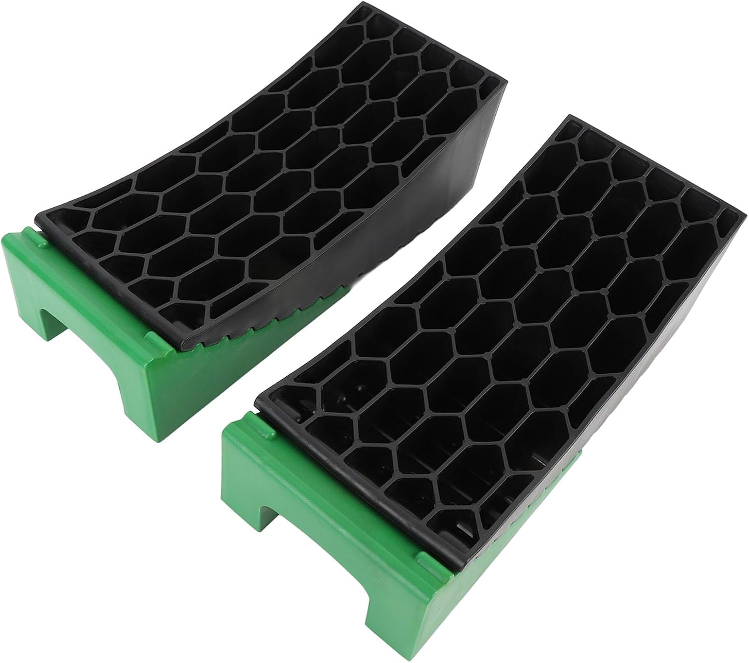[Lightweight and Portable] Includes carry bag for easy transport, making it for travel and camping. [Heavy Duty Capability] Supports vehicles up to 35000lb, ensuring reliable stabilization for your RV or trailer. [Sturdy Material] Made from high strength materials that withstand wear and pressure, ensuring long-lasting use. [Versatile Applications] Ideal for leveling uneven ground and for vehicle maintenance tasks like tire and engine repairs. [Practical Design] Curved shape enhances tire replacement access, simplifying the vehicle leveling process and improving user experience. Item Type: Curved Leveling Block Included Accessory: 2 x Ramp Blocks, 2 x Triangular Blocks, 2 x Anti Slip Pads Adjustable Height Range: Approx. 1.27 - 10.16cm / 0.5 - 4in Maximum Load Capacity: Approx. 35000lb / 15875.7kg Maximum Compatible Tire Size: Approx. 81.28cm / 32in Fitment: Suitable for RV Campervan Travel Trailer motorhomes dual axle trailers 2 x Ramp Blocks 2 x Triangular Blocks 2 x Anti Slip Pads 1 x Carrying Bag