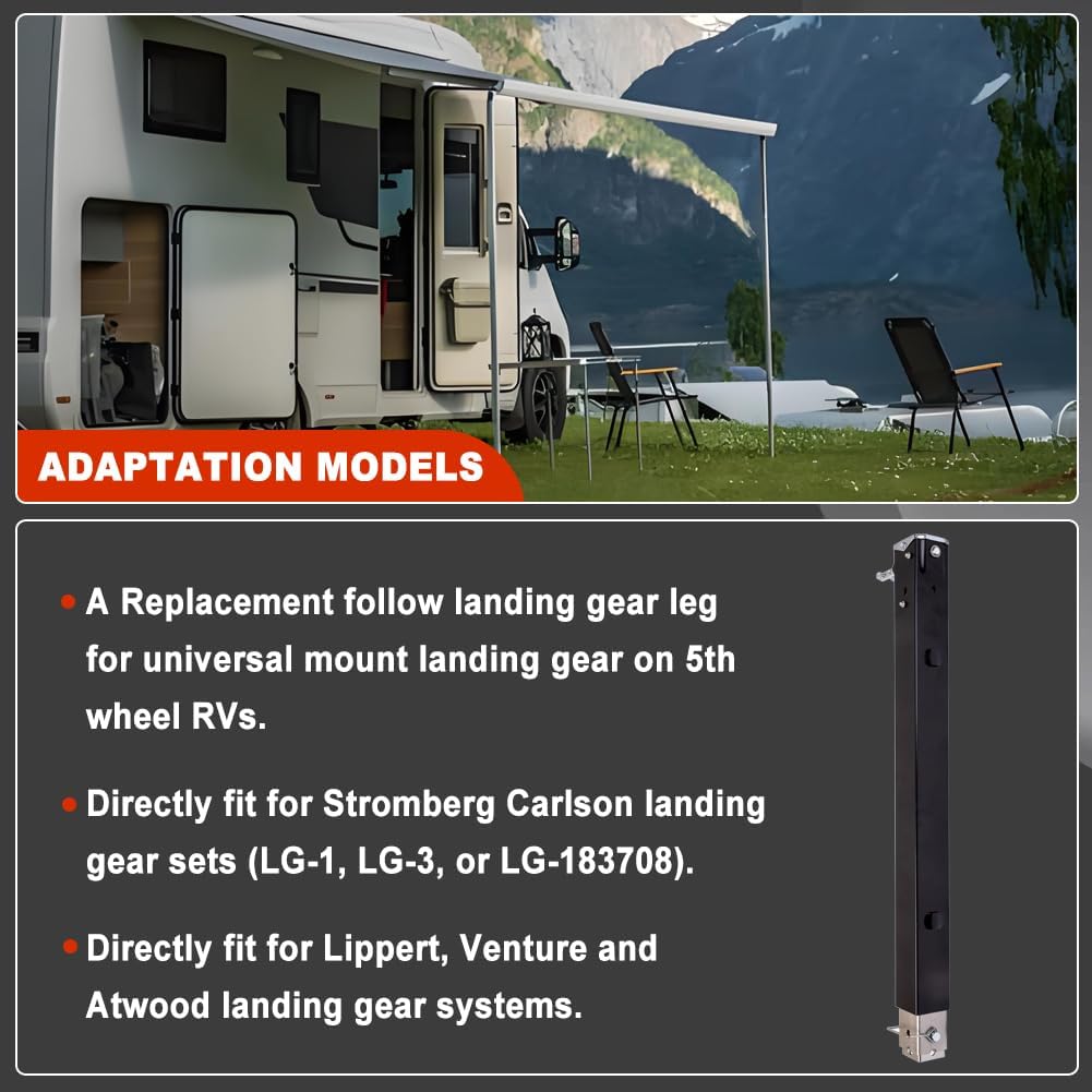 Condition:Brand NewColor:BlackLeg length:29-1/2"Replace Part Number:LG-179013Compatible with:A Replacement landing gear lead leg for universal mount landing gear on 5th wheel RVs.Directly fit for Stromberg Carlson landing gear sets (LG-1, LG-3, or LG-183708).Directly fit for Lippert, Venture and
