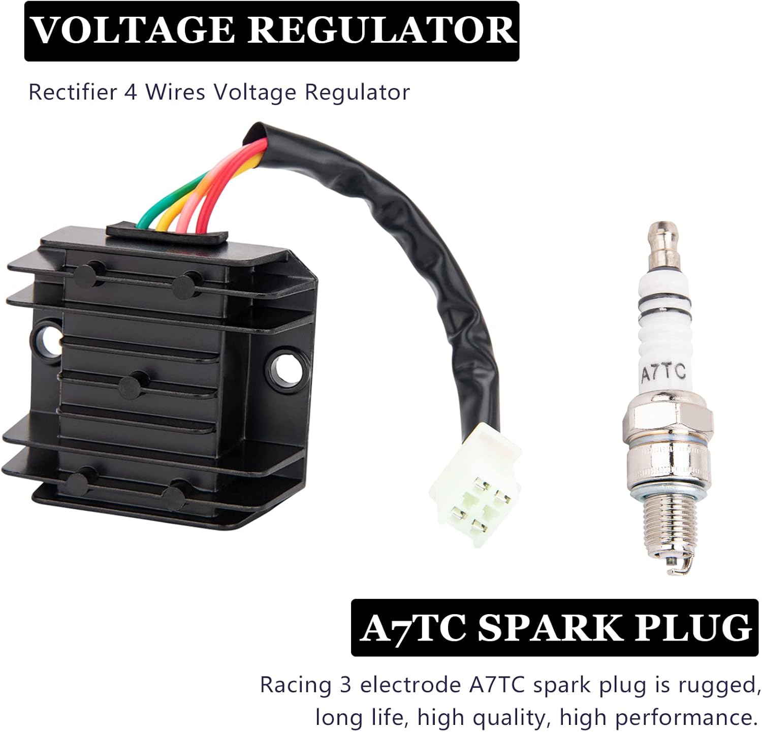 High Performance Racing GY6 Ignition Coil Kit Compatibility of GY6 ignition coil kit Fits for GY6 50cc 125cc 150cc 4-stroke Engines Scooter ATVs Go Karts Mopeds Quad Pit Dirt Bikes. Fits for most of Chinese Made Scooters and ATV Such as Kymco JONWAY JMSTAR ROKETA SUNL TANK PEACE TAOTAO Dongfang Kazuma JCL BMS. Quality GY6 ignition coilReplacement of a new ignition coil can improve combustion efficiency and enhance electrical performance. Quality 6-pin AC CDI boxThis 6-pin AC CDI box is made of stable quality material shell, not easy to damage, long service life Package includes: 1 x GY6 ignition coil 1 x 6-pin AC CDI 1 x A7TC spark plug 1 x regulator rectifier 1 x solenoid relay Note:Please check the compatibility before you buy. If you have any questions about the GY6 ignition coil kit, please feel free to contact us and we will be the first to solve your problem and provide you with satisfactory service.