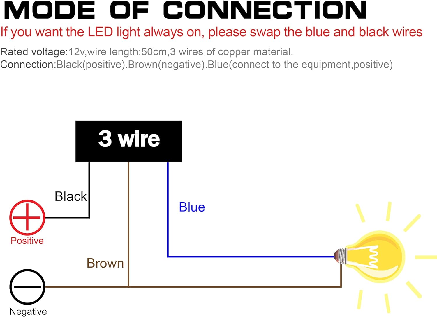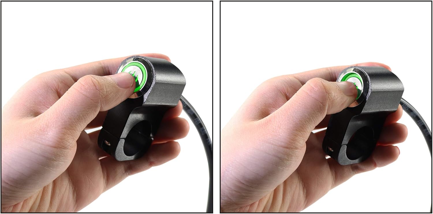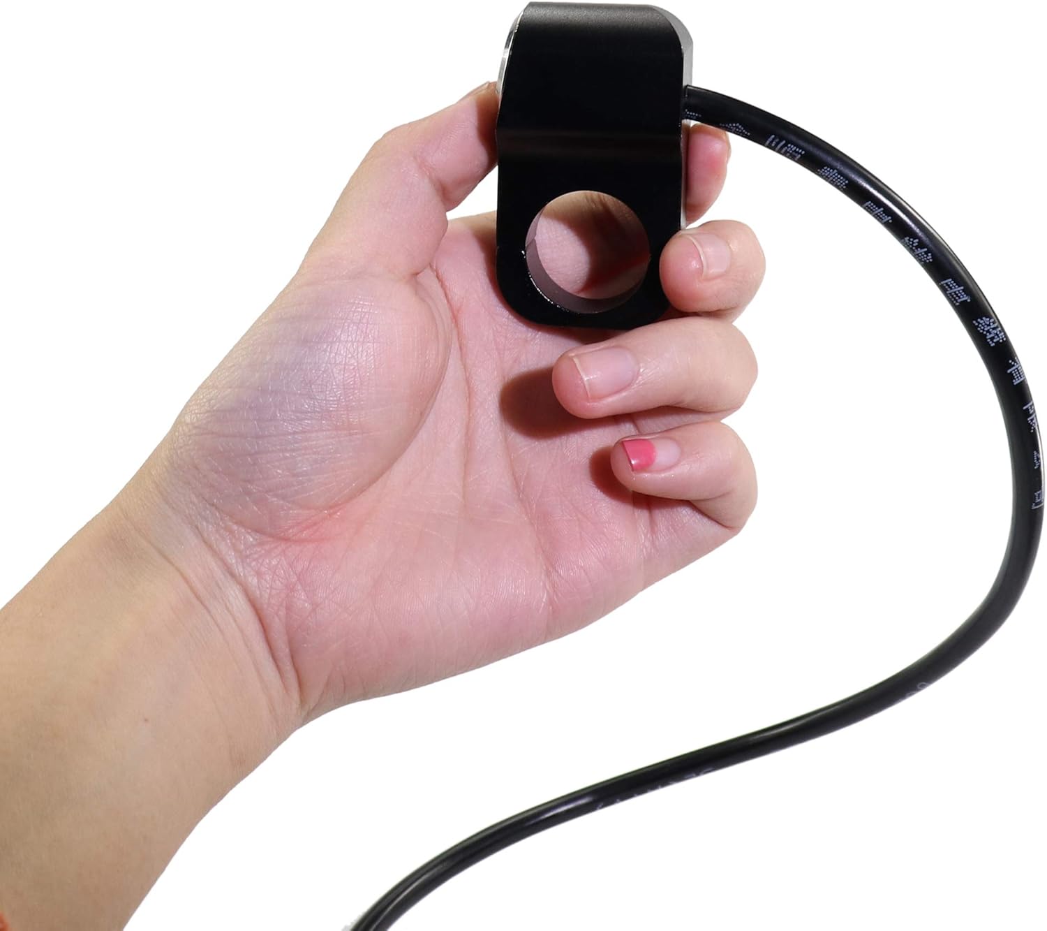 Feature: Color:black Diameter:22mm Cable lenght:Approx.50cm Current:10A Volatge:12V Electrical: On-Off Case Material :aluminum-alloy. Case Material :aluminum-alloy+ anode sand blasting process. Mounting Holder apply for Grips Diameter:22-23mm/0.78"-0.90" Connection:Blue(positive).Brown(negative).Black(connect to the equipment,positive)