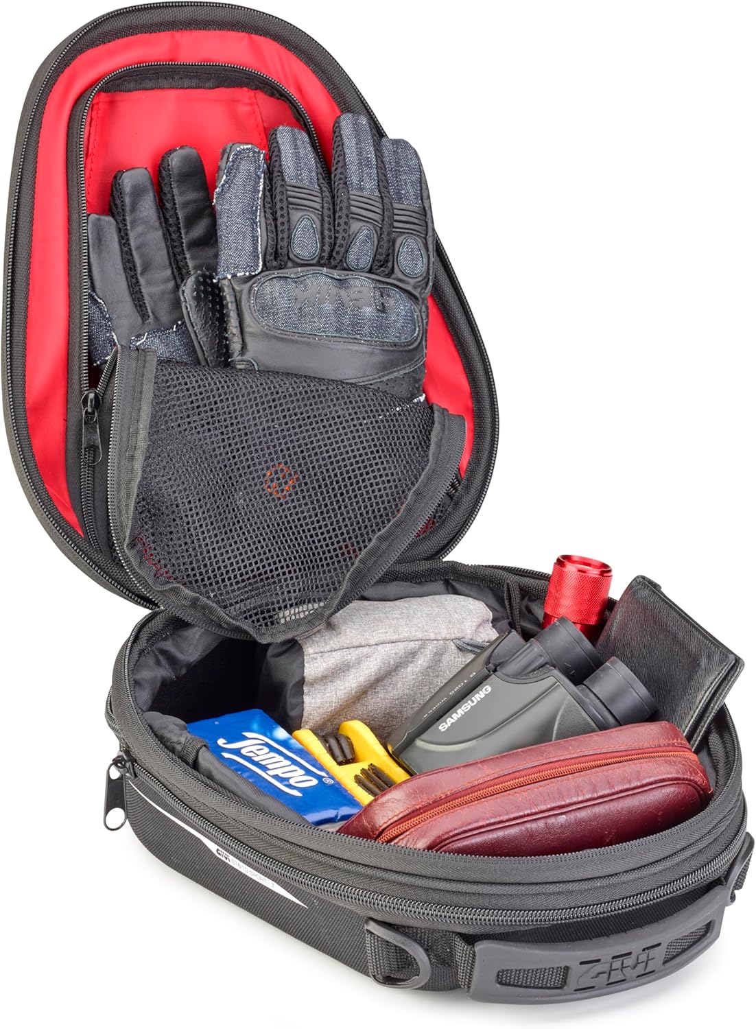 This versatile GIVI ST610+ motorcycle bag combines functionality and practicality for demanding motorcyclists. With a 6 litre base capacity, expandable to 10 liters, it offers ample space to carry essentials on your travels. The thermoformed construction ensures durability and retains its shape even in harsh conditions. The TANKLOCK system, exclusive to GIVI, allows a secure and quick attachment to both the tank and the motorcycle saddle. Featuring sturdy zippers with red pulls for easy opening even with gloves, this bag also features reflective details for added visibility. The aerodynamic design in sleek black blends seamlessly with the aesthetics of the bike, while the waterproof construction protects the contents from the elements. Ideal for everyday use or longer trips, it is a smart storage solution for every rider