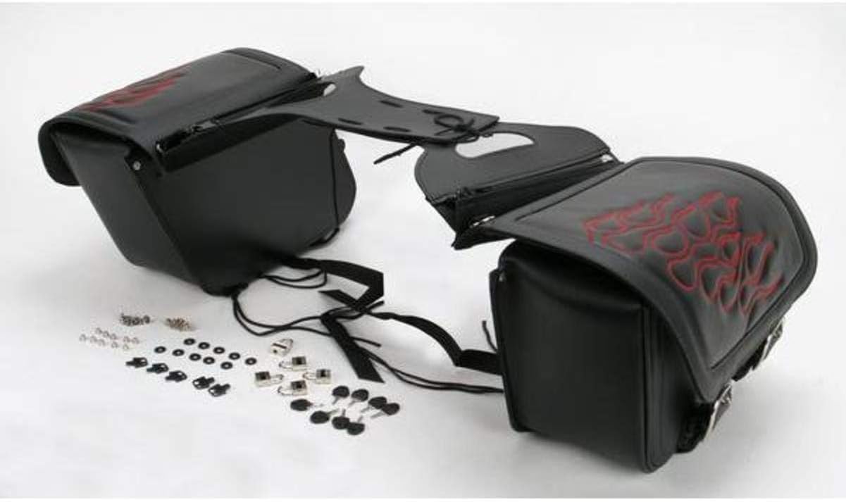 Feature deep-textured 3-D embroidered flames in a variety of colors; flame design matches saddlemen's tattoo flame seats. Removable yoke included for over-the-fender mounting; can also be installed using SADDLEMEN S4 quick-disconnect saddlebag docking post and fastener kit (see page )???. made of a durable combination of materials including genuine leather, marine grade vinyl and chrome-plated brass. Genuine leather dual-strap design with heavy-duty, lockable chrome buckles and hidden, lockable quick-release buckles (two locks included; one per bag).