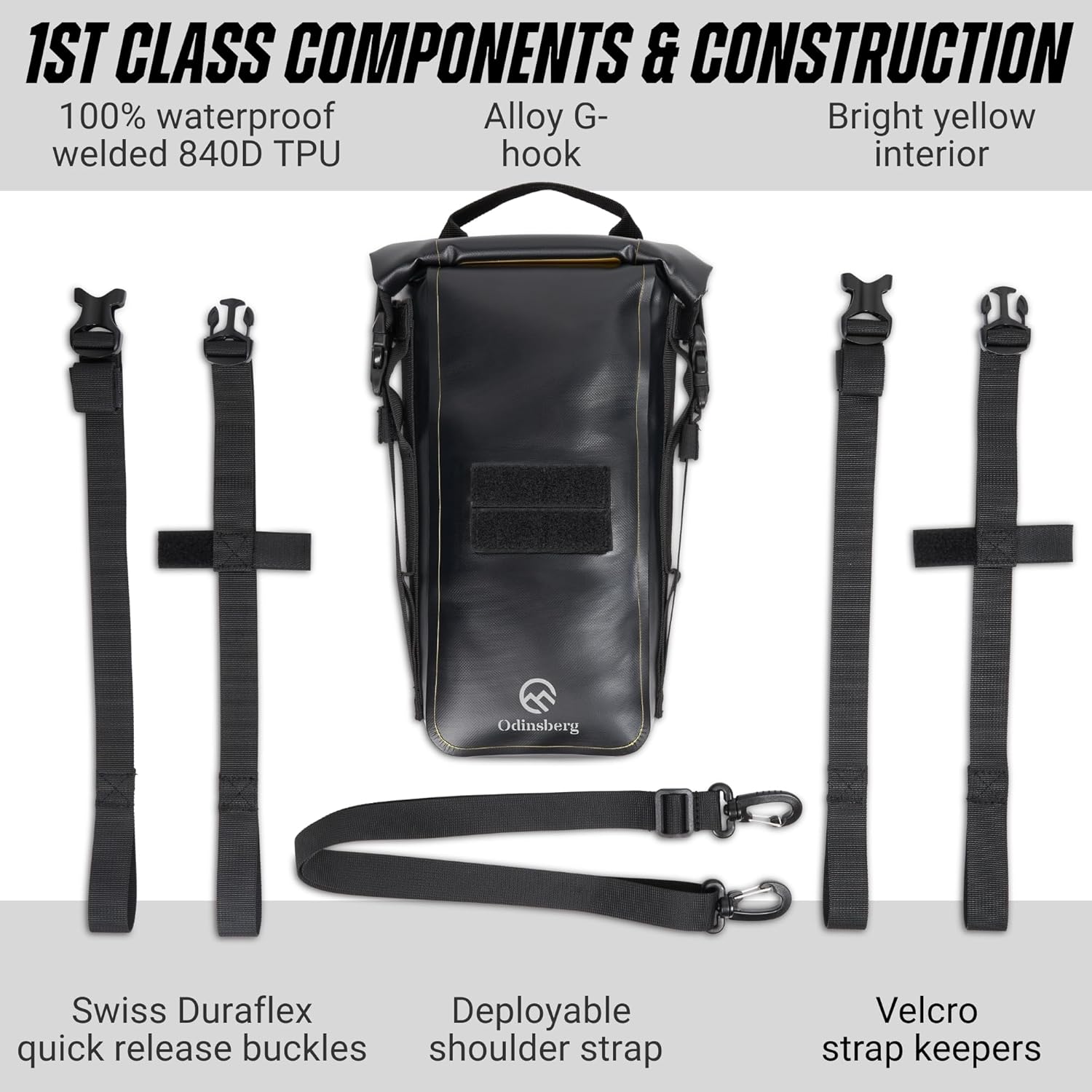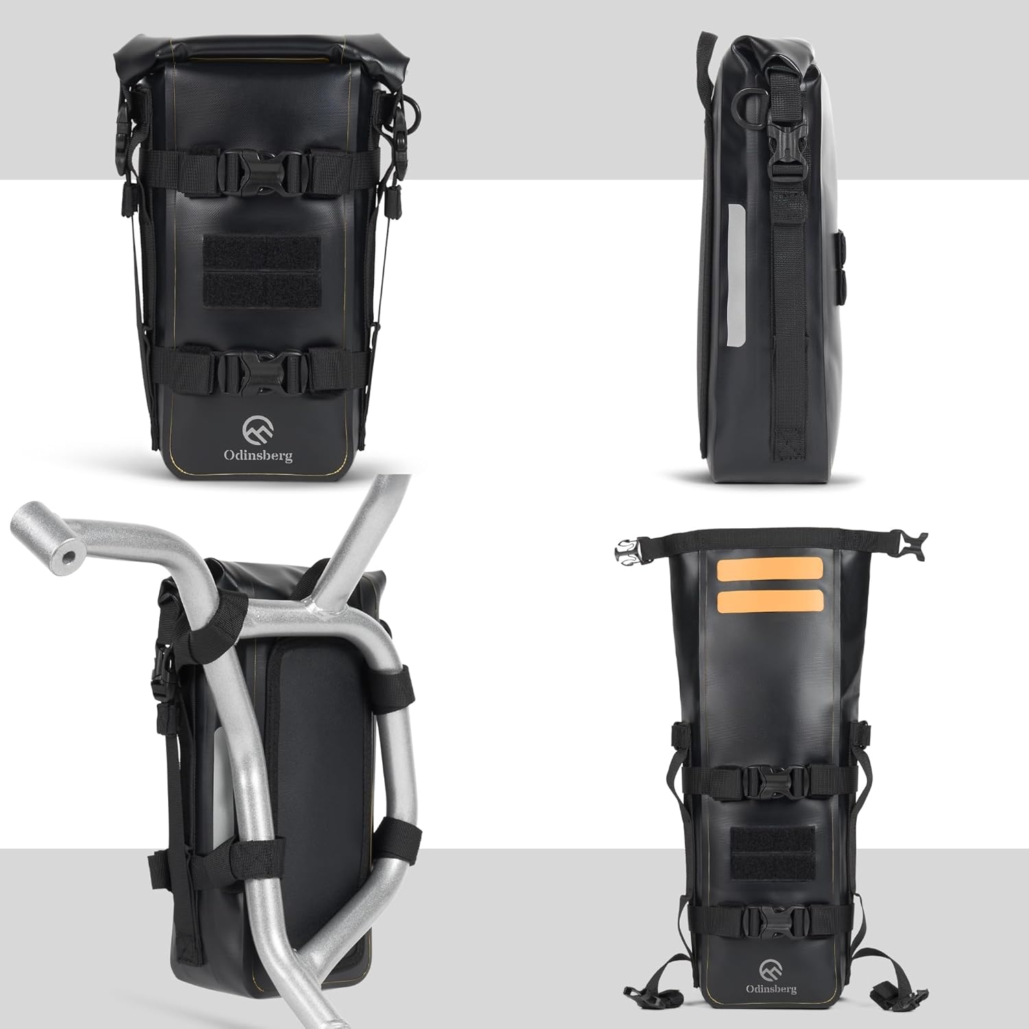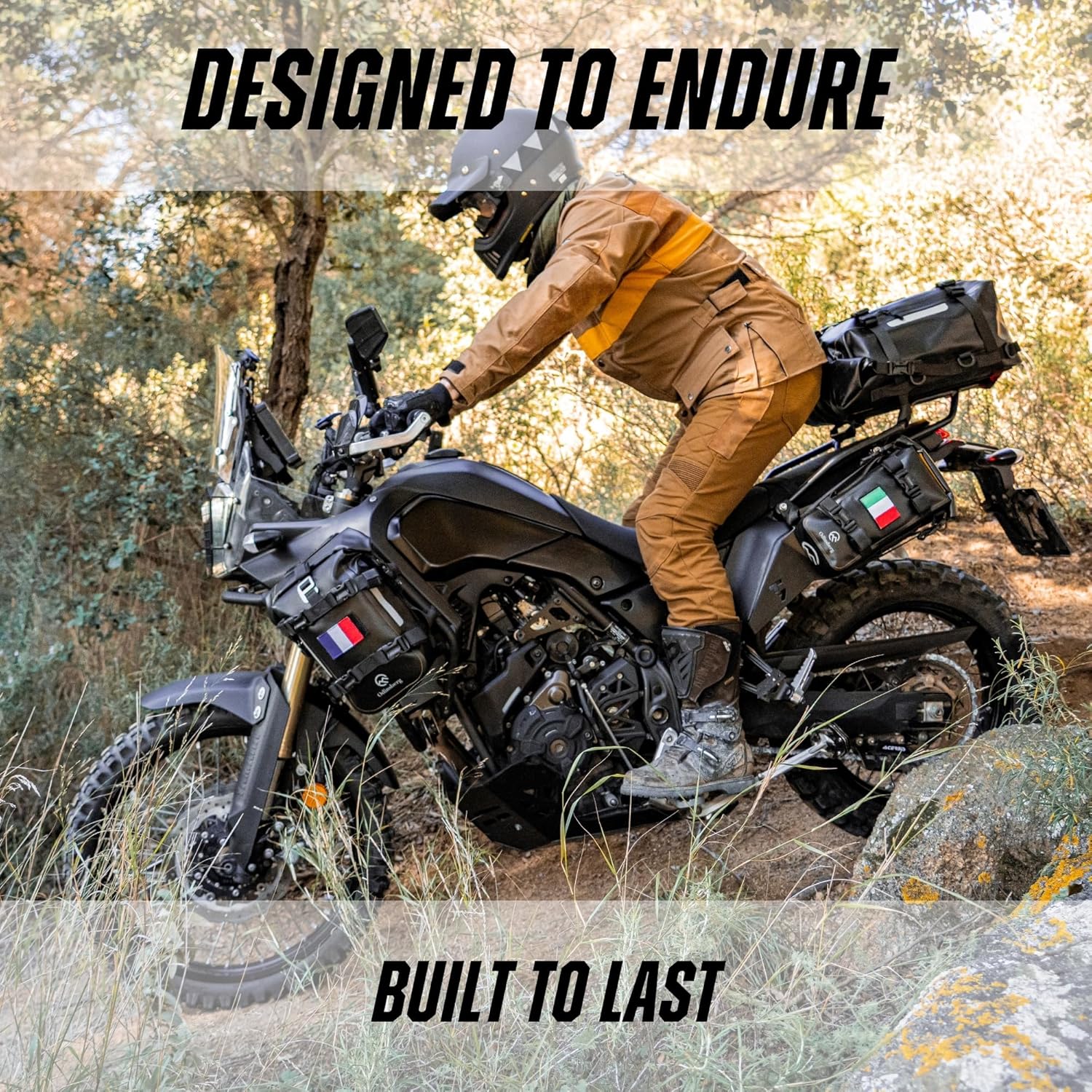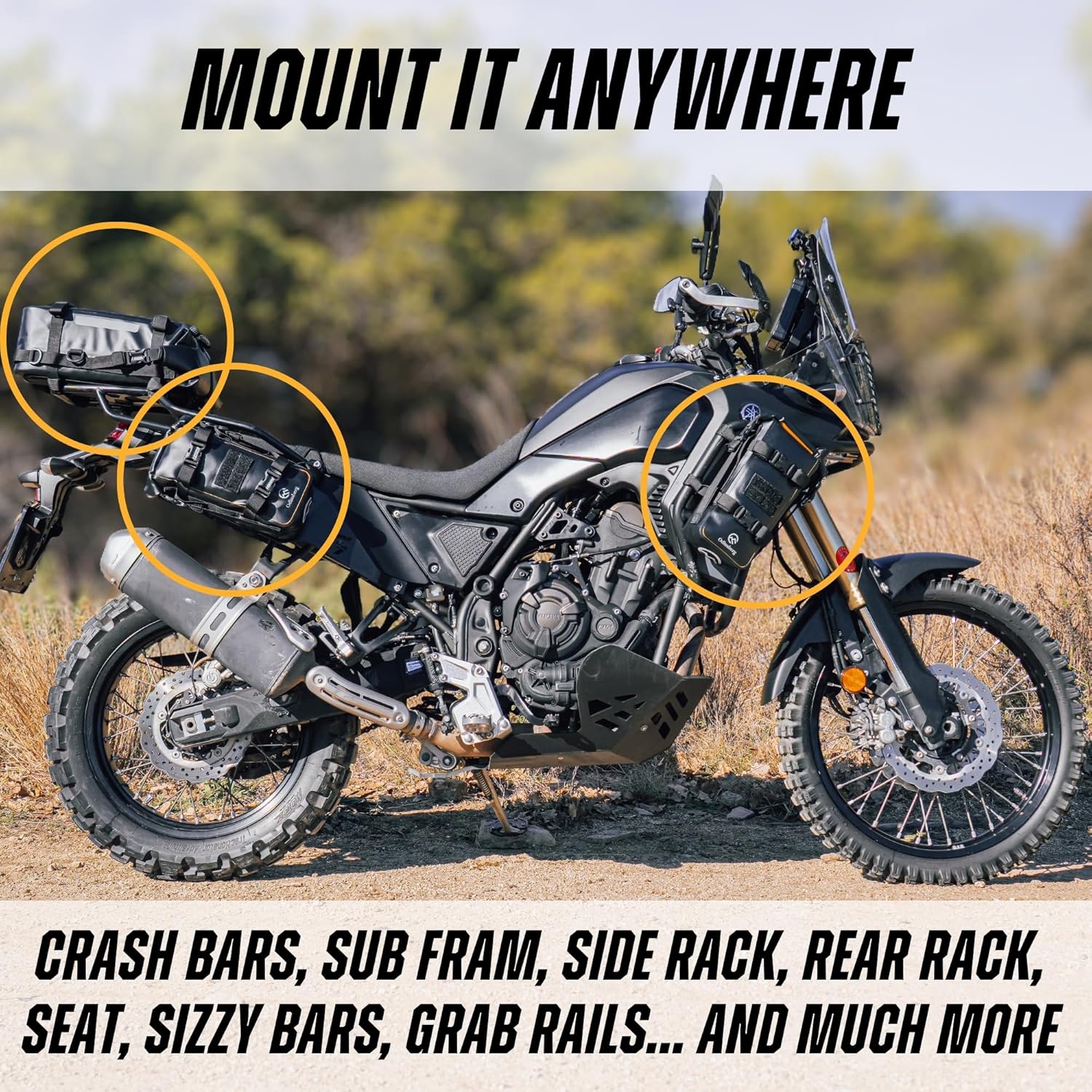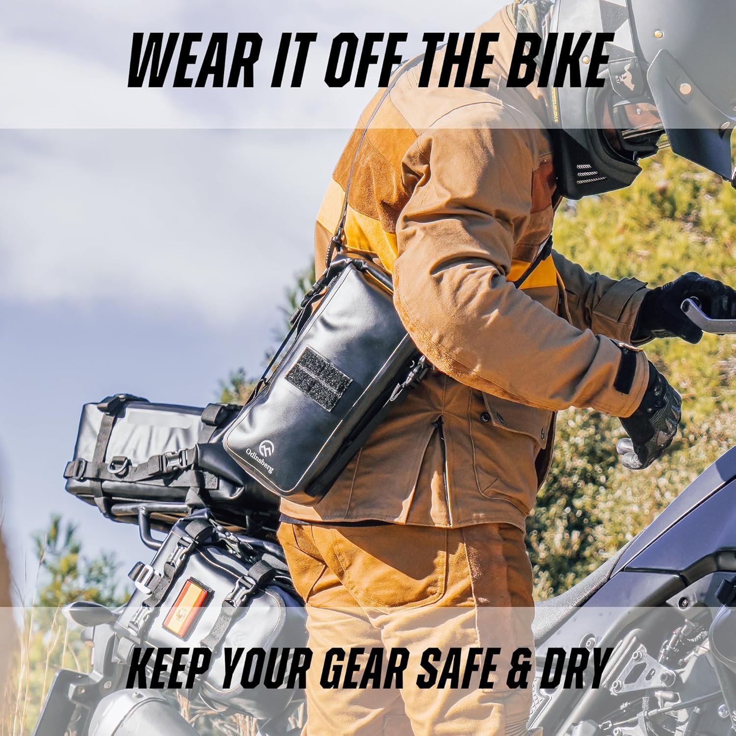 With 3.5 liters of packable volume, the Ragnarök 3.5L motorcycle travel bag is a super-rugged, universal welded-seam, roll-top motorcycle motorcycle storage dry bag built to carry tire irons, a spare tube, a compressor, tools, and other small off-road essentials. It’s 100% waterproof—and also dustproof and mudproof—so your gear stays protected no matter the conditions. Designed to fit virtually any motorcycle make or model, the motorcycle gear bag can be securely anchored to engine guards, crash bars, tail racks, or other motorcycle gear rack. Use it as a motorcycle tailbag, engine storage bag, or even a compact soft pannier, or mount it as a motorcycle motorcycle gear storage on top of larger Ragnarök tail packs, hard panniers, or motorcycle tank bag as extra motorcycle soft luggage. Off the bike, it converts into a possibles bag / sling bag, making it ideal for hikes, sightseeing, and quick day trips. Improvements of this version: The main exterior fabric has been upgraded from Hypalon to 840D TPU laminated Ballistic Nylon, which is more abrasion resistant, flexible, and easy to clean. The quick release buckles are now genuine Swiss Duraflex buckles. The material used for the webbing on the cinch straps has been upgraded to better handle impacts during crashes.