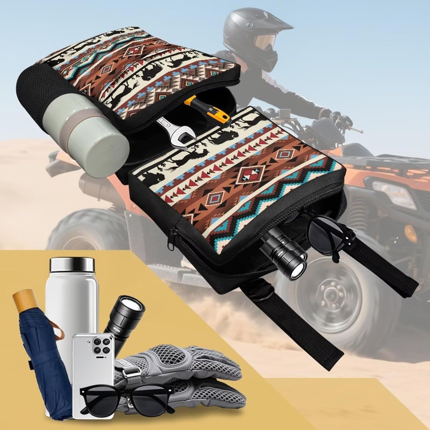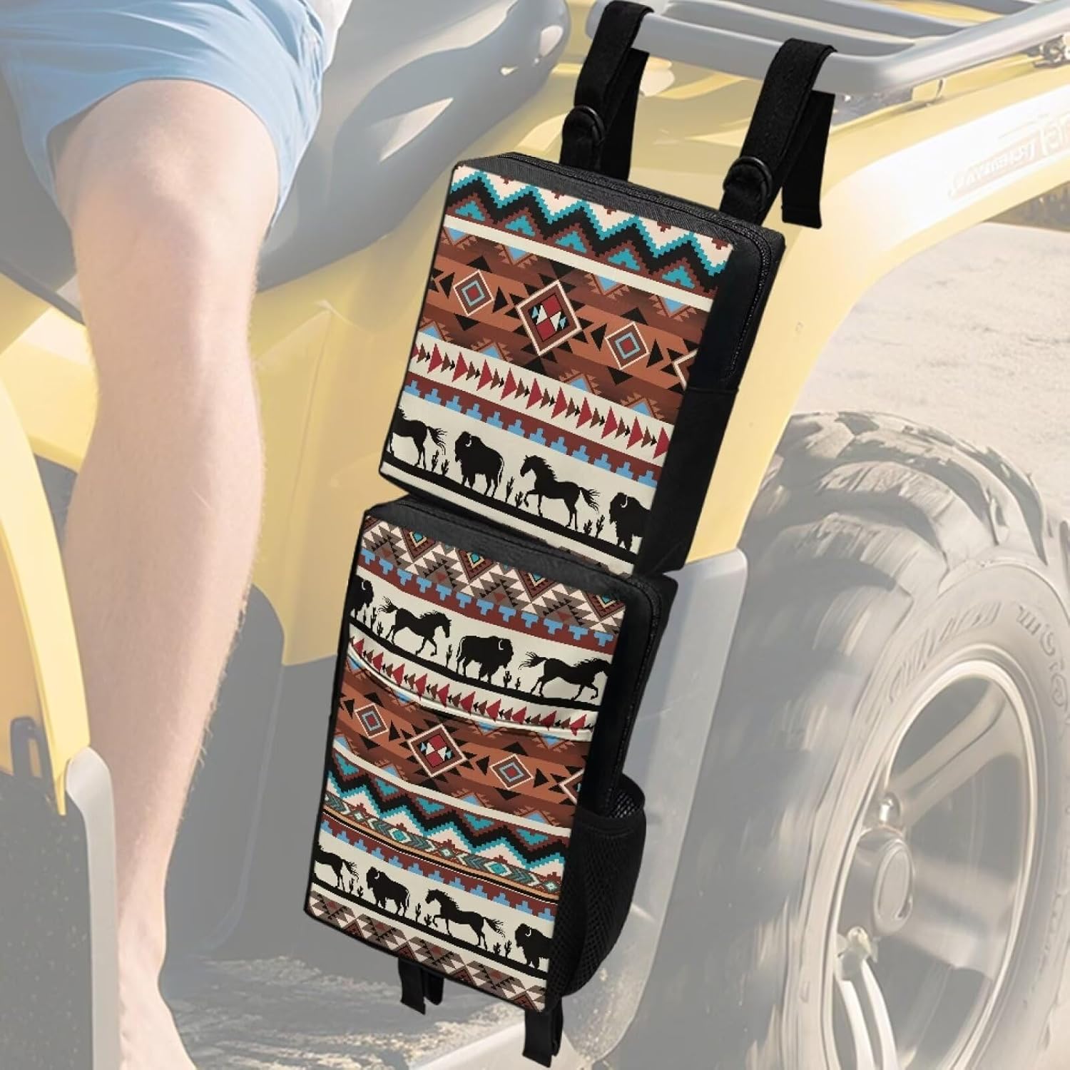 Specification Size : Please check our size chart before ordering Material: polyester Package: 2 PCS Feature Do you need to hold a lot of stuff on your ATV? Are you tired of carrying bulky luggage rack bags or suitcases? 2-pack ATV fender bags are great value for extra storage. You can quickly and easily reach without having to stop and mess with a large storage box. Fender bag for ATV will not interfere with any operations at all. Universal ATV storage bags fit most ATVs. The different compartments are fine for keeping things separated. You can store your gloves, small tool kits, flashlights, maps, snacks, med kits, rain gear, etc. Our ATV fender bags will keep your items as clean and dry as when you put them in the ATV gear bag. Washing Instructions It is recommended to wash by hand and wash with cold water. Do not soak for a long time, do not bleach, and do not exposed to sunlight for a long time Notes We are committed to providing you with high quality products and excellent service. If you have any questions or need further information, please feel free to contact us