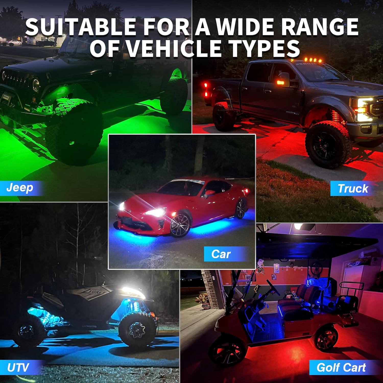 LD DARKEAGLE RGB LED Rock Lights bring vibrant colors and supreme illumination to your vehicle. With 24 high-intensity SMD 3528 LED chips, these lights create a captivating underglow effect. Control them effortlessly with an app, remote, or keychain, offering 16 million RGB colors and 29 dynamic modes. Housed in a durable, waterproof alloy metal aluminum casing, they withstand various environments, perfect for off-road adventures. Experience true white light with RGBW technology, making your truck, ATV, or SUV exceptionally eye-catching. The easy installation package includes 6 extension wires and all necessary accessories for vehicles with 12v-18v DC power sources. Enjoy worry-free after-sales support with a 60-day refund or replacement policy and a 24-month product warranty. Upgrade your vehicle's lighting confidently with LD DARKEAGLE.