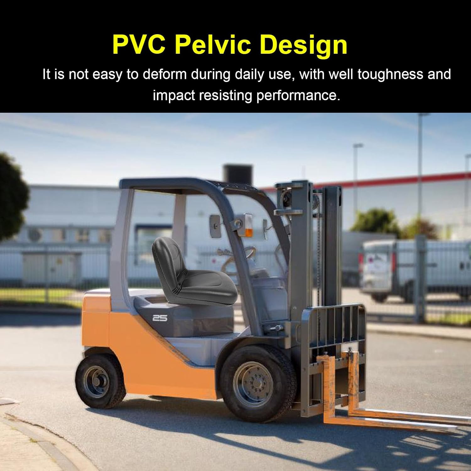 [Ergonomic Comfort] This seat features a wraparound design that contours perfectly to your body providing exceptional comfort and support. the sturdy construction ensures full body support during extended use while the high resilience polyurethane foam cushioning enhances driver comfort. [Versatile Compatibility] This forklift seat is designed with adjustable mounting holes ranging from 0 to 12 inches, whether you operate small electric units or large fuel powered machines this seat offers quick adaptability for operators who frequently switch between equipment. its versatile design boosts work efficiency by reducing downtime during replacements. [Easy Installation] Featuring integrated sliding rails this universal seat ensures secure installation and effortless adaptability to various machinery. the rail system allows for quick replacement of old or damaged seats minimizing equipment downtime. [Construction] Crafted from premium pvc leather and high density polyurethane foam this seat combines durability with easy maintenance. the rugged materials resist wear and tear and remaining simple to clean. [Safety First] Equipped with a advanced gravitational sensing micro switch this seat ensures your forklift only operates when you are properly seated. this safety feature prevents accidental movement of machinery. Spec: Item Type: Forklift Seat Product Material: PVC, Polyurethane Foam Seat Size: Approx. 455 x 525.8 x 408mm / 17.9 x 20.7 x 16.1in Package List: 1 x Forklift Seat How To Use: Install and use