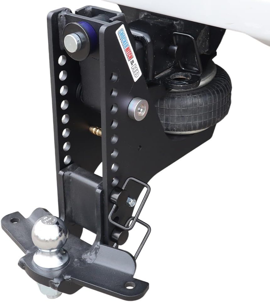 The Shocker HD Max Black Super Drop Air Drop Hitch is a must-have towing solution, specifically designed for trucks with a ground clearance of at least 22 inches from the ground to the bottom of the receiver tube. If trailer sway is an issue, here is the solution. The drop mount has sway bar mount tabs, and the air ride system absorbs the bumps, bangs, tugs, jerks & sways. Get a smoother, safer towing setup. This high-clearance requirement makes it ideal for lifted pickups or vehicles with leveling kits, providing enhanced towing stability and comfort. The hitch features an integrated air ride system that filters road shock, ensuring a smoother ride when towing heavy trailers or campers.With a 20,000 lbs towing capacity and 2,000 lbs tongue weight, the Shocker HD Max Super Drop is built for heavy-duty towing needs. The adjustable drop ball mount provides a drop range of 4-1/2" to 12-1/2", offering flexibility for various towing setups. The hitch comes with either a 2" or 2-5/16" hitch ball. It also includes welded sway control tabs for compatibility with basic friction sway control systems, which helps minimize trailer sway for a more controlled and stable towing experience. The matte black powder-coated frame ensures durability and corrosion resistance, keeping the hitch looking great for years.Manufactured in the USA by Shocker Hitch® in Jamestown, ND, this air ride hitch mounts into 2", 2-1/2", or 3" receiver tube. It?s designed to serve as a "mini air suspension unit" between your truck and trailer, providing a smoother, more comfortable towing experience while reducing stress on both the truck and trailer. For anyone with a lifted truck or those seeking a more controlled and stable towing experience, the Shocker HD Max Black Super Drop Air Drop Hitch is an essential upgrade.Note: The sway control tab mount is designed to work with the Shocker Friction Sway kit or a similar friction sway control kit, which is not include
