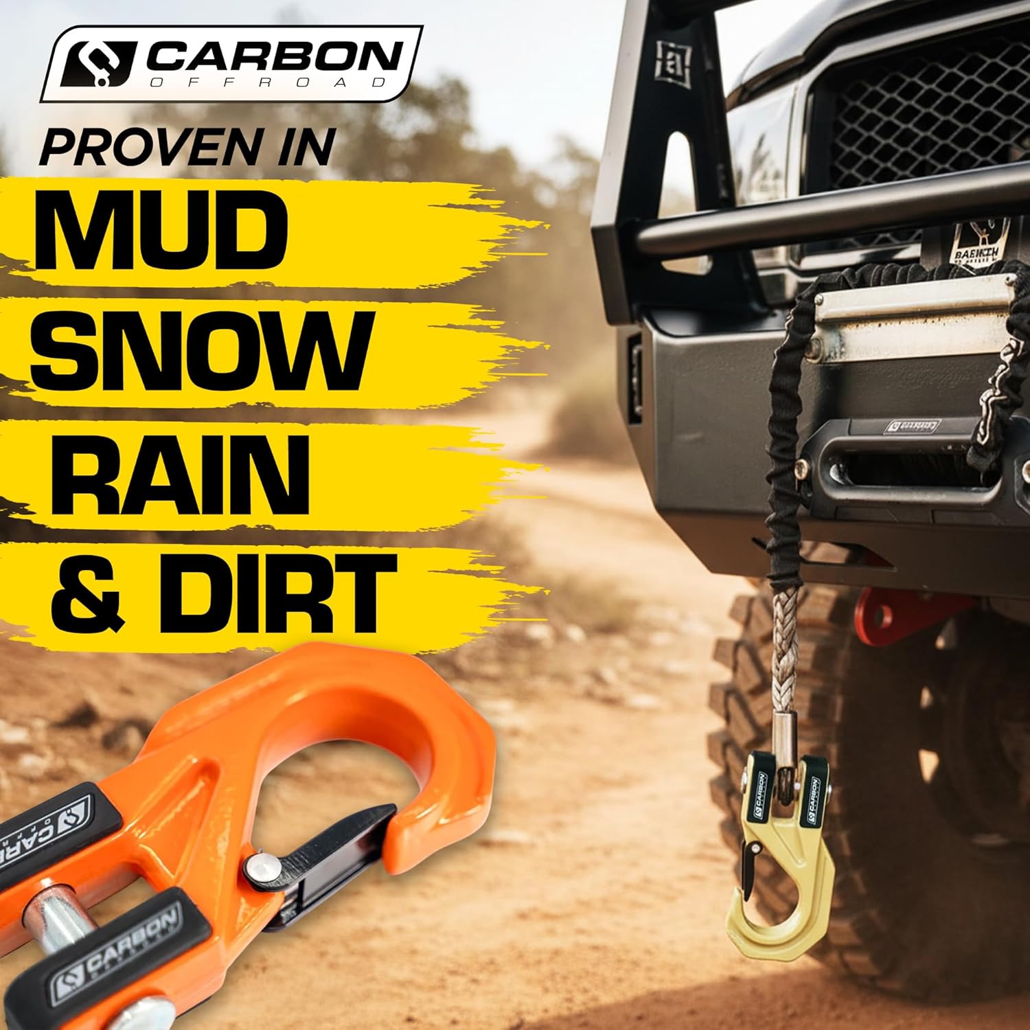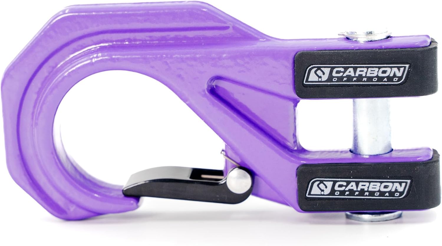Carbon Offroad MegaPro Winch Hook – Engineered Muscle for Off-Road Recovery The Carbon Offroad MegaPro Winch Hook isn’t some generic hook pulled out of the parts bin from the local lifting and rigging supplier. This heavy-duty winch hook was designed, engineered, and FEA-tested in-house by our team, then forged by our manufacturing partners to handle the brutal demands of real off-road recovery. Every detail was dialed in from the ground up. We built prototypes, tested fit and function, and pushed the limits until we had a hook that’s stronger where it matters and trimmed down where it doesn’t. The result? Maximum muscle without unnecessary weight. The MegaPro’s I-beam construction and cast alloy gate deliver a hook that’s both lightweight and nearly indestructible. It’s forged and heat-treated from 40Cr alloy steel, then finished with a durable powder coat that protects against UV degradation and corrosion. When it’s time to hook up, the MegaPro is ready. It stows flat or upright on your fairlead and connects to tree straps or soft shackles with one hand—fast, simple, secure. The through-pin and circlip system makes mounting it to your winch rope a no-nonsense job anyone can do. Tested and proven safe on winches up to 20,000 lbs, the MegaPro has the muscle to haul anything: ATVs, UTVs, Jeeps, SUVs, trucks, trailers, you name it. Removable press-fit rubber pads with logos let you customize the look, and a touch of rubber cement locks them in place permanently. Bottom line: if you want gear that can yank your rig out of mud, sand, or steep trails without flinching, the MegaPro Winch Hook delivers.